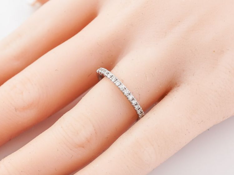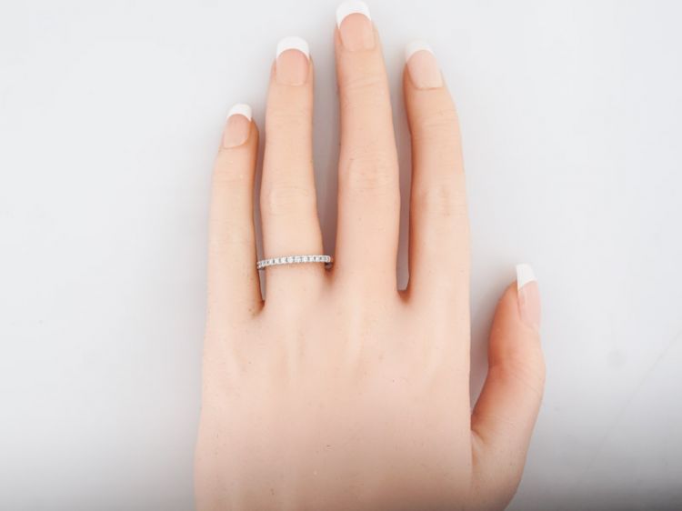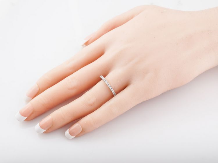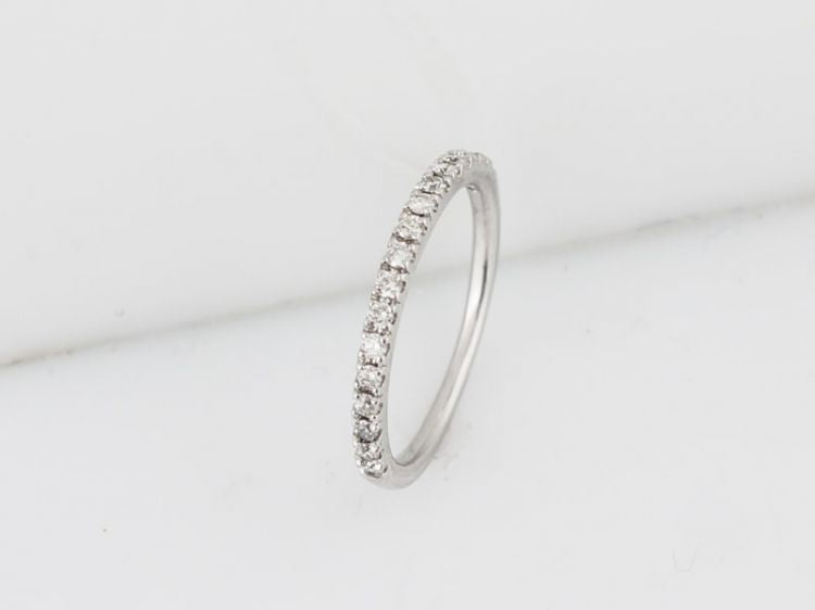 This classic modern wedding band features seventeen (17) round brilliant diamonds. The diamonds are individually prong set across the bridge of the finger. This 14 karat white gold diamond band has a total weight of .25 carats and measures 1.84 mm in width. The shank of the ring is finished in a high polish.