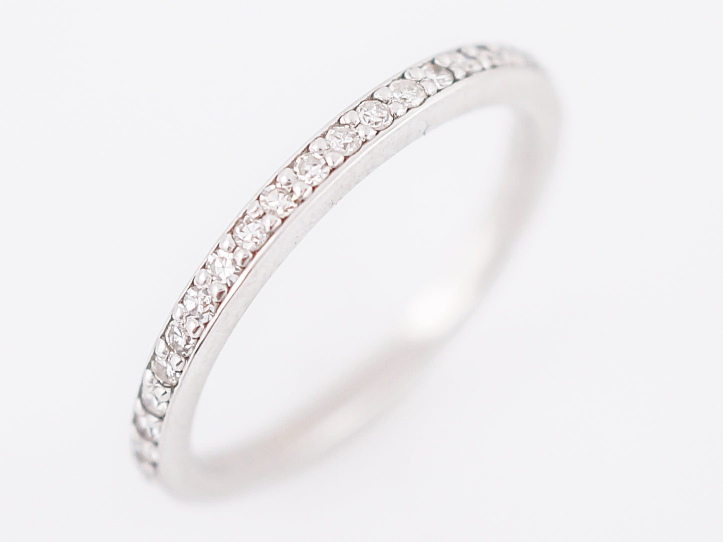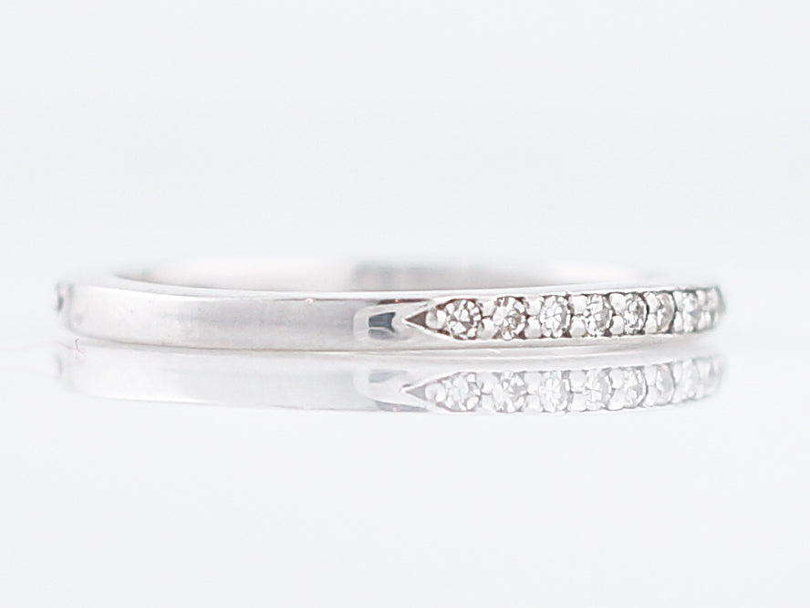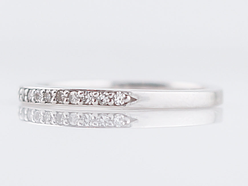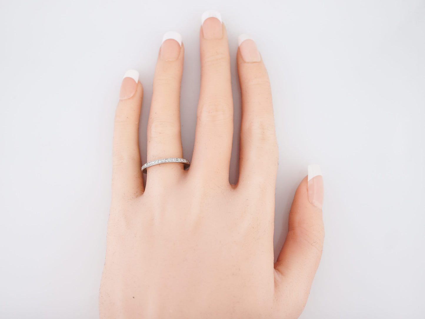 This modern wedding band features .32 carats of single cut diamonds set in a shimmering 14k white gold band. Thirty-two (32) single cut diamonds are bead set across the top half of the band, creating an all diamond appearance when worn. With its elegant look, this band would pair well with most antique or modern engagement rings.