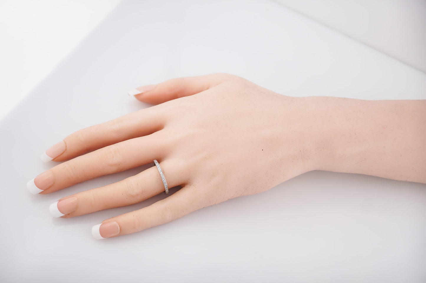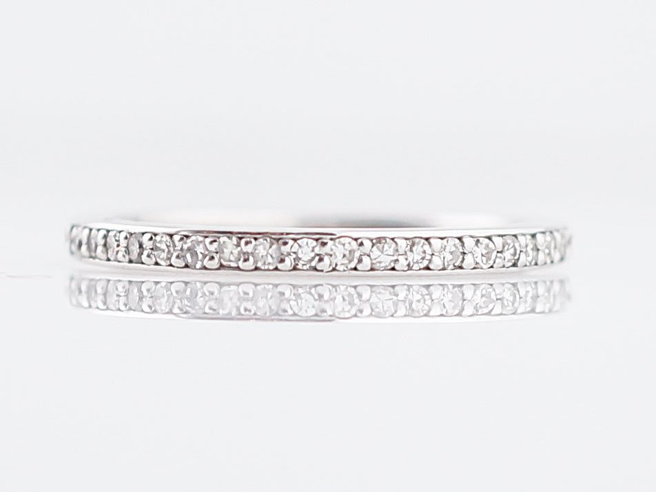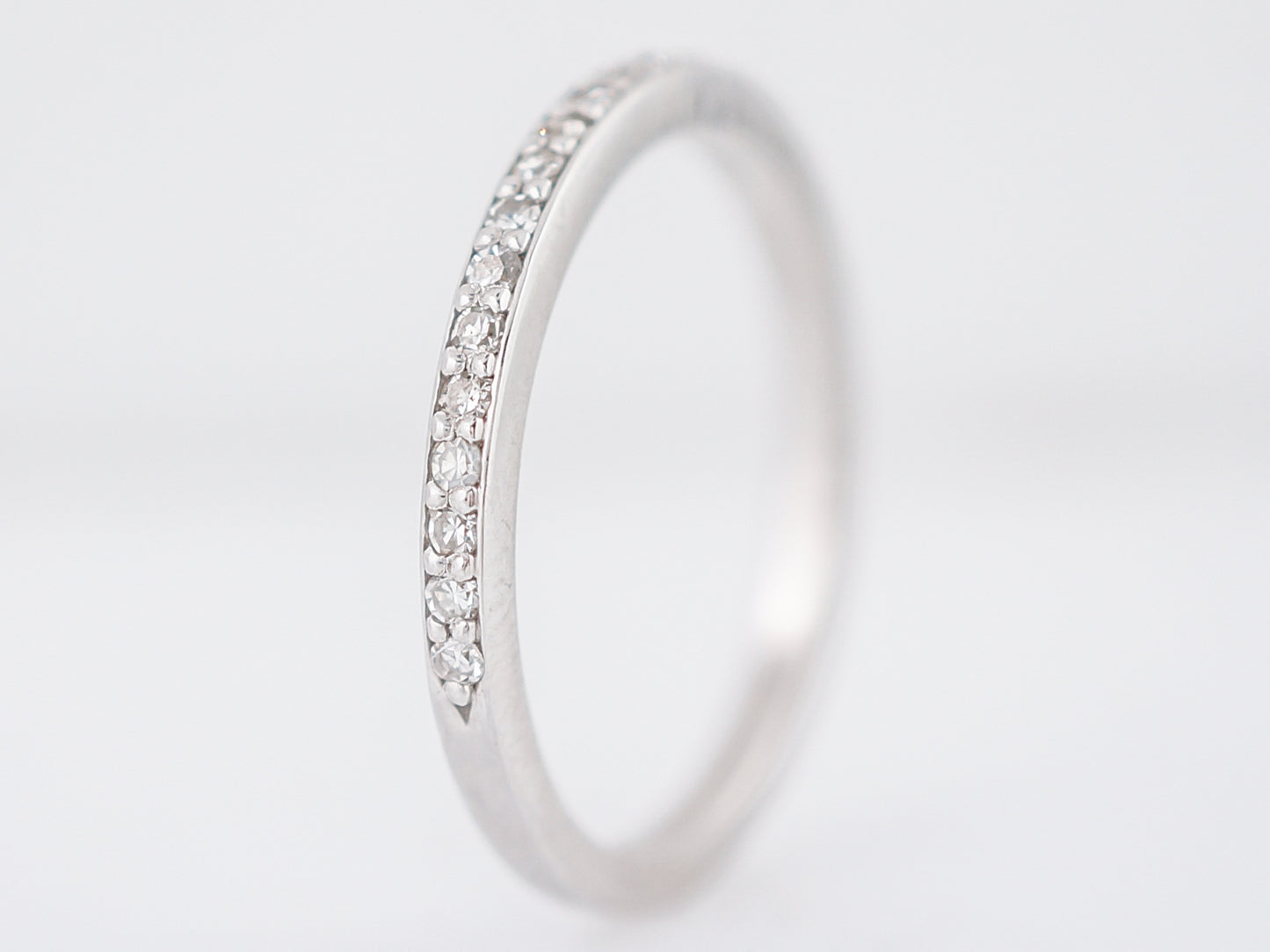 This modern wedding band features .32 carats of single cut diamonds set in a shimmering 14k white gold band. Thirty-two (32) single cut diamonds are bead set across the top half of the band, creating an all diamond appearance when worn. With its elegant look, this band would pair well with most antique or modern engagement rings.