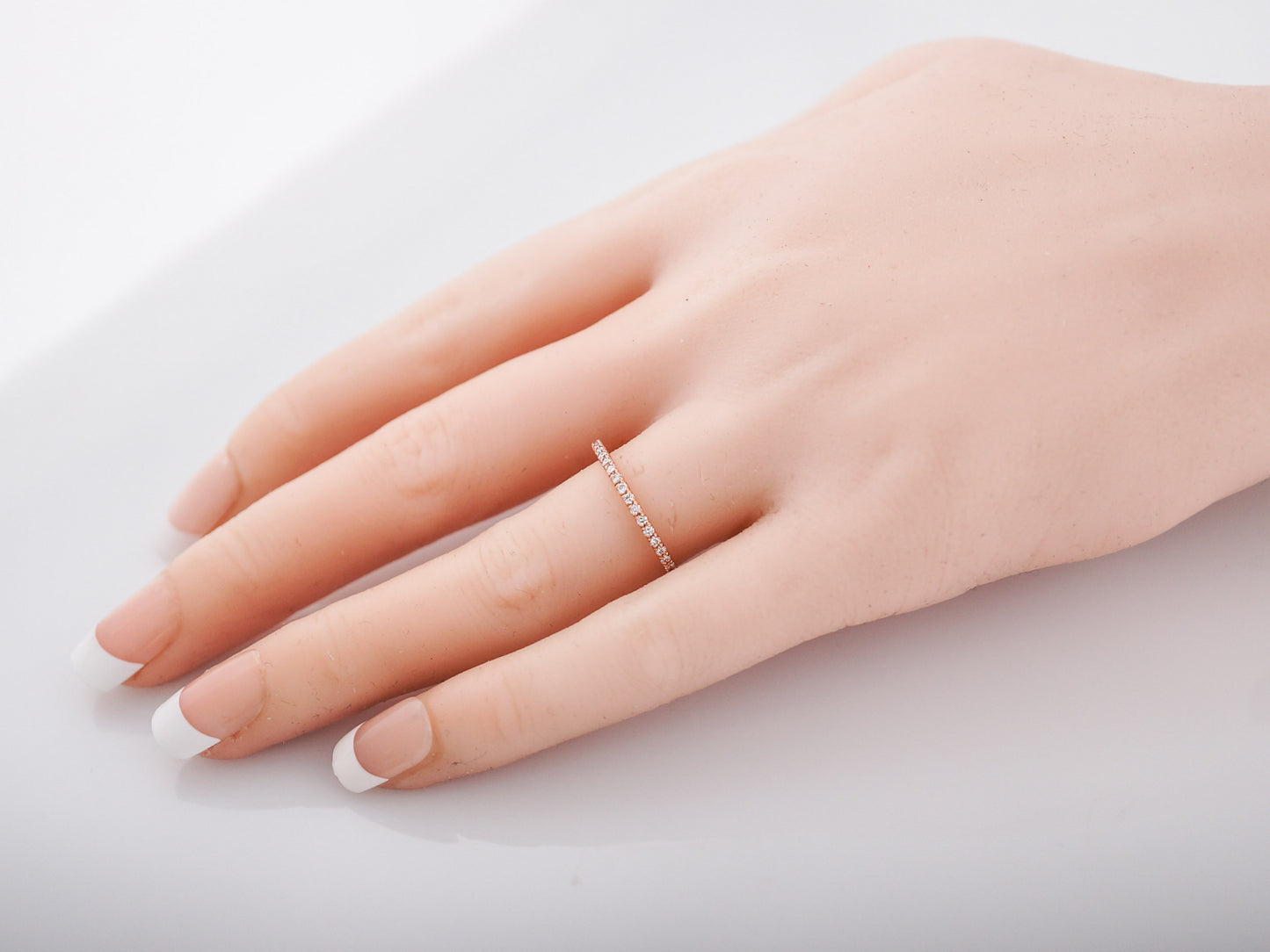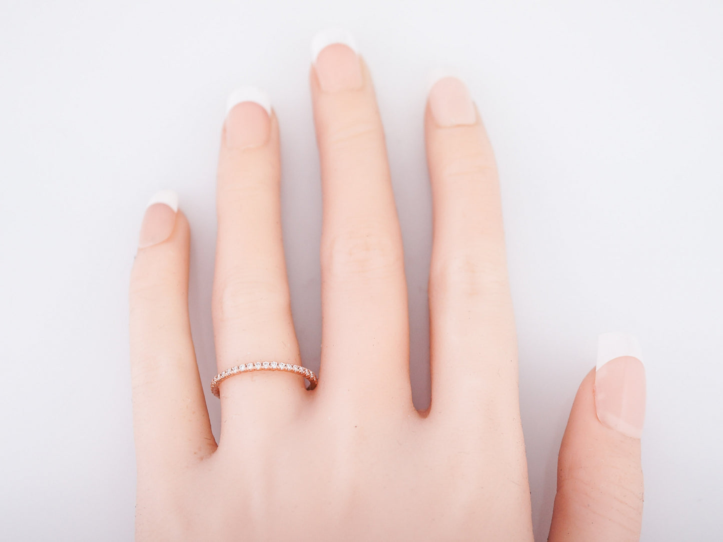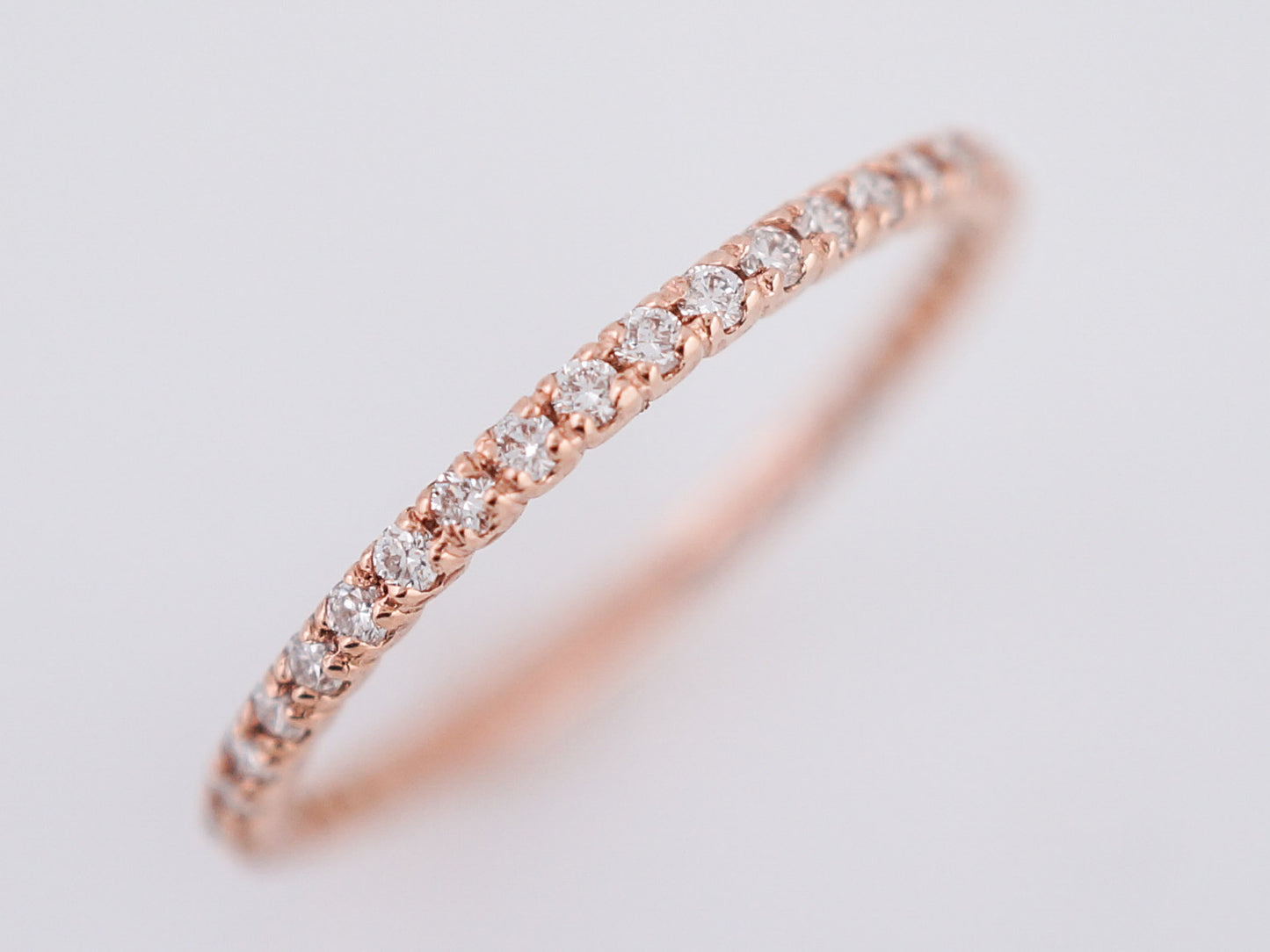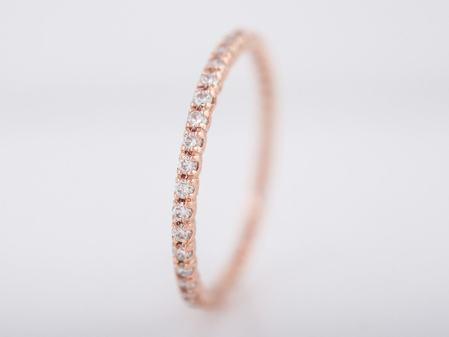 This modern, 14 karat rose gold wedding band has fifteen (15) round brilliant cut diamonds which weigh .39 cttw., and are fishtail set nearly all the way around the band. The band is 1.60mm wide, making it a dainty band that perfectly pairs with any engagement ring or can we worn alone for a simple statement.