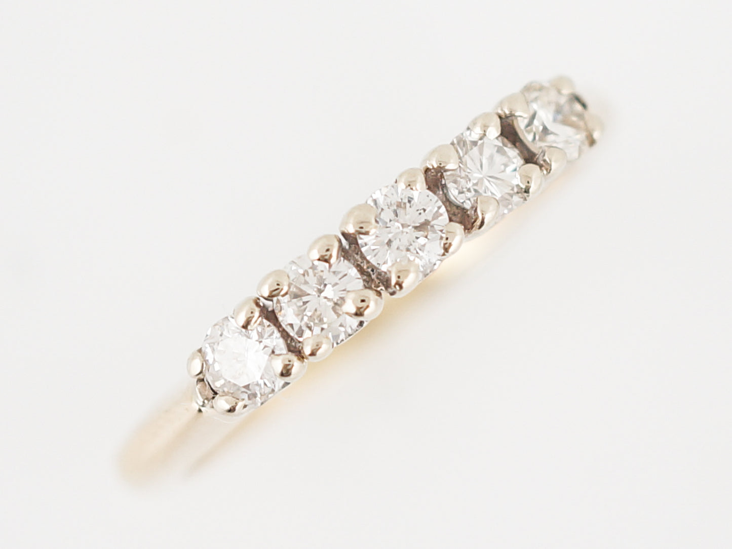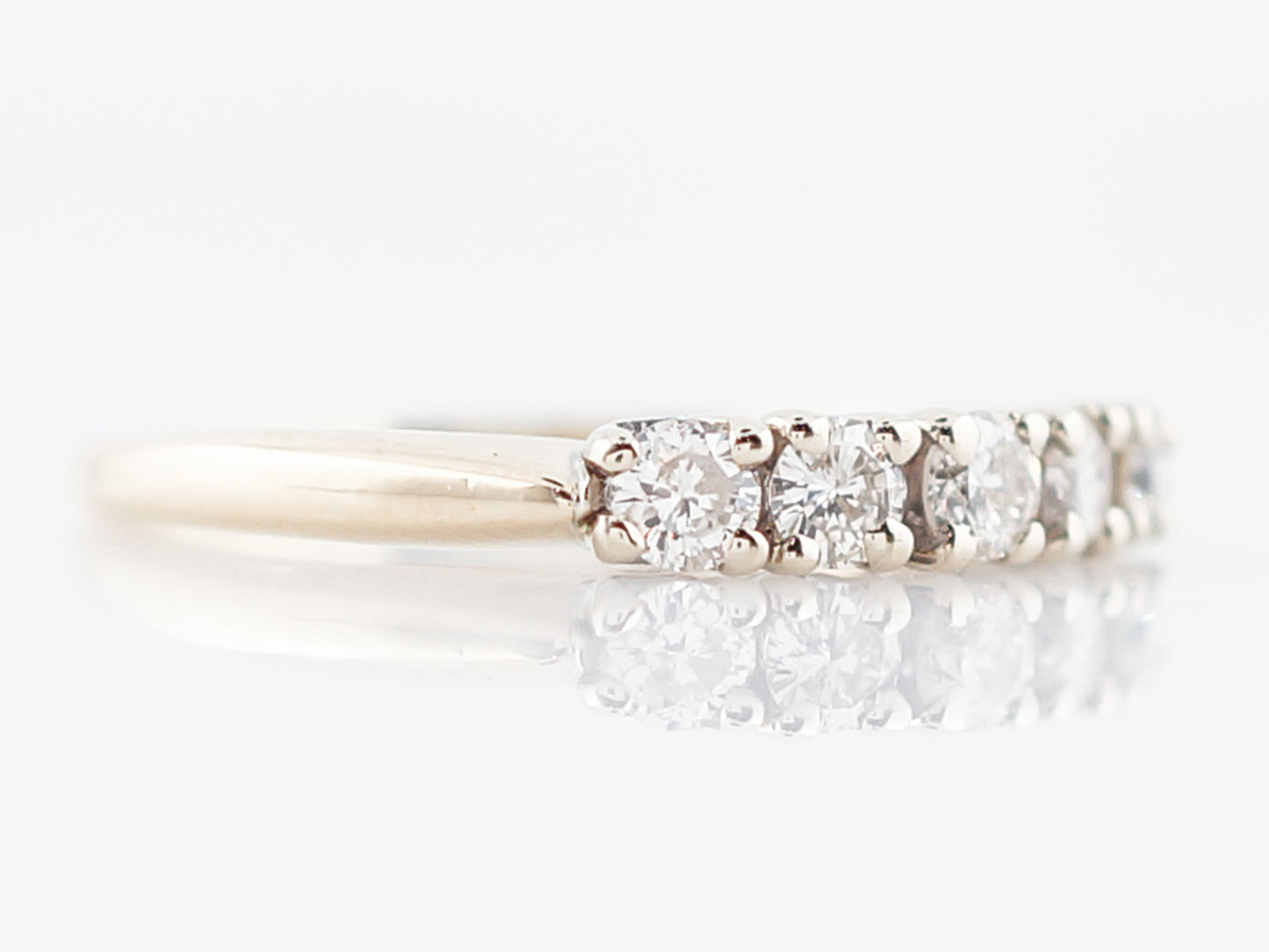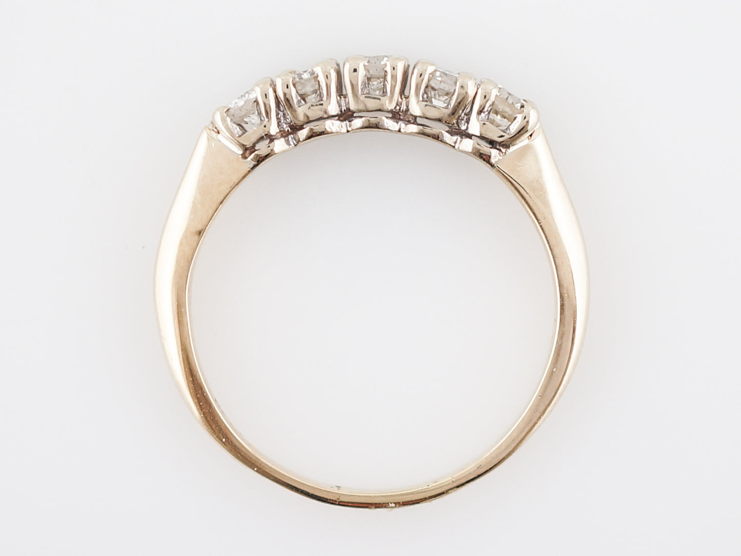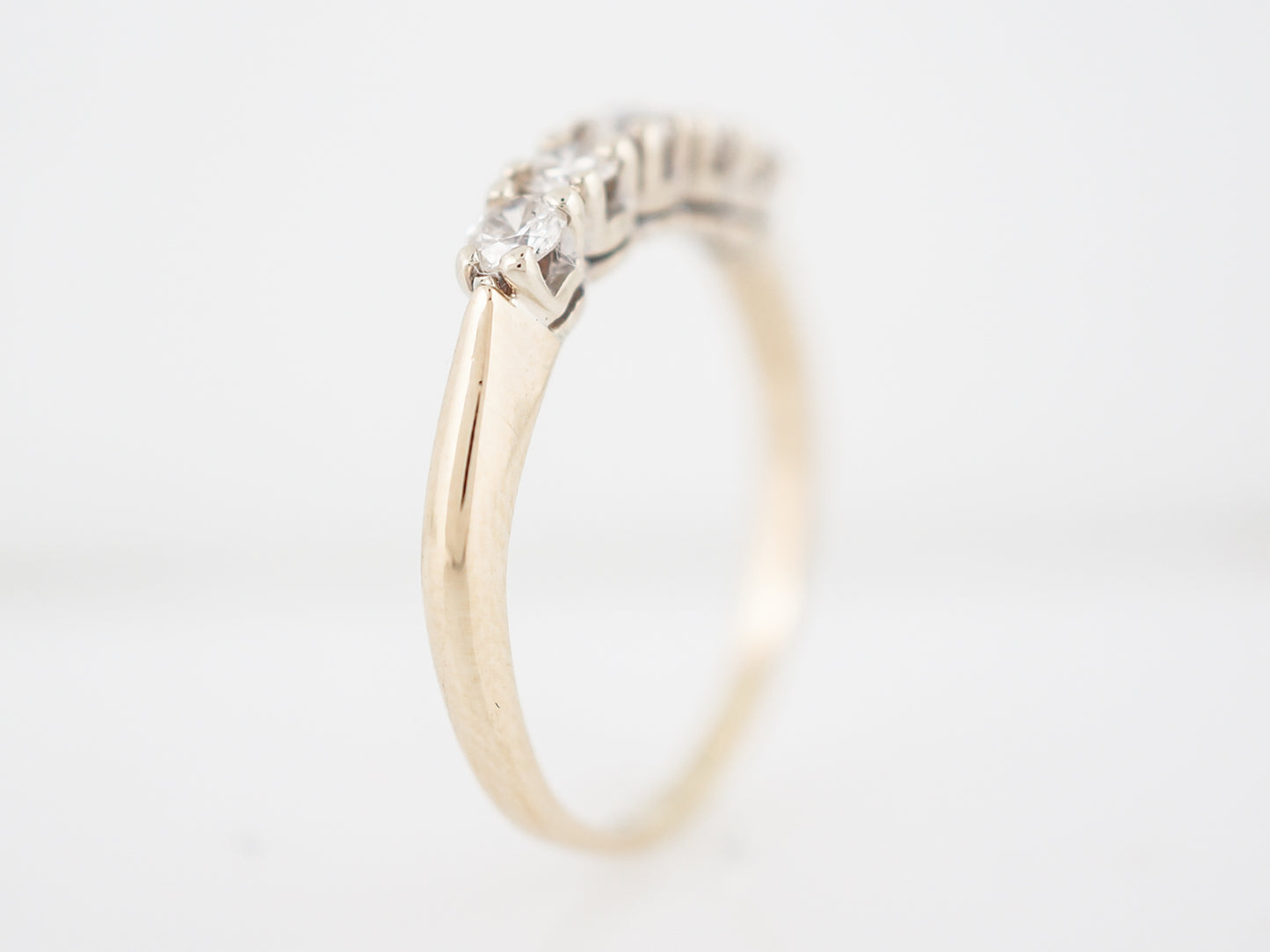 This Modern Era, five (5) diamonds wedding band has a timeless look. Five (5) diamonds are prong set into 14 karat yellow and white gold with a total weight of 0.40 carats. The band has a slight taper away from the diamonds, but the profile is fairly flat allowing it to sit flush against an engagement ring.