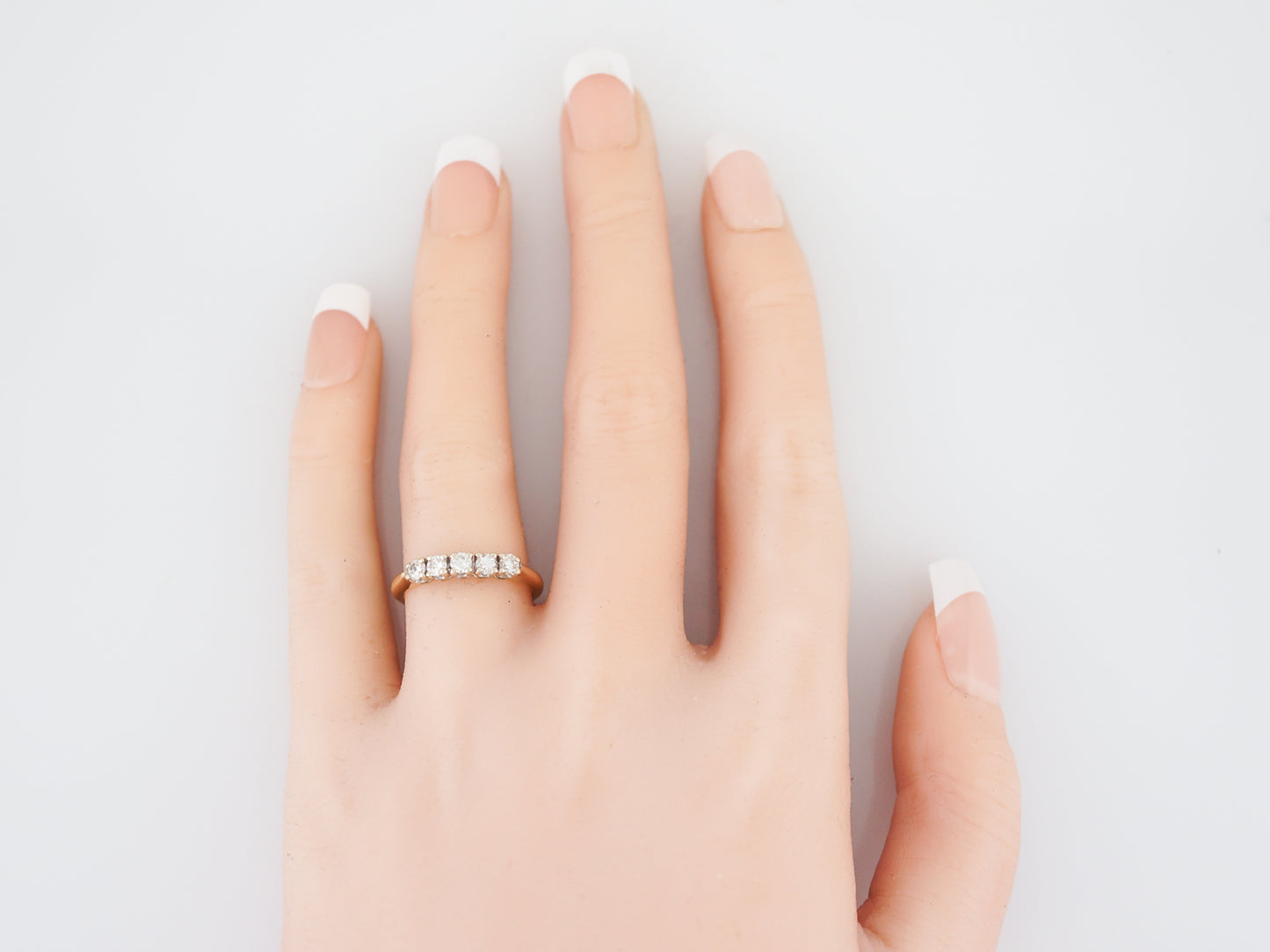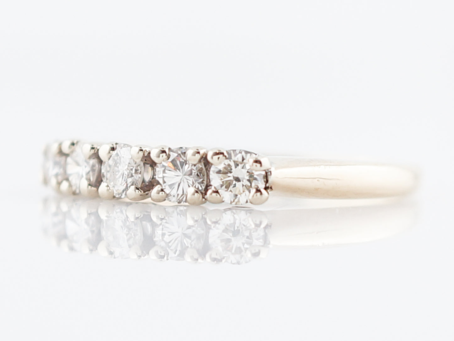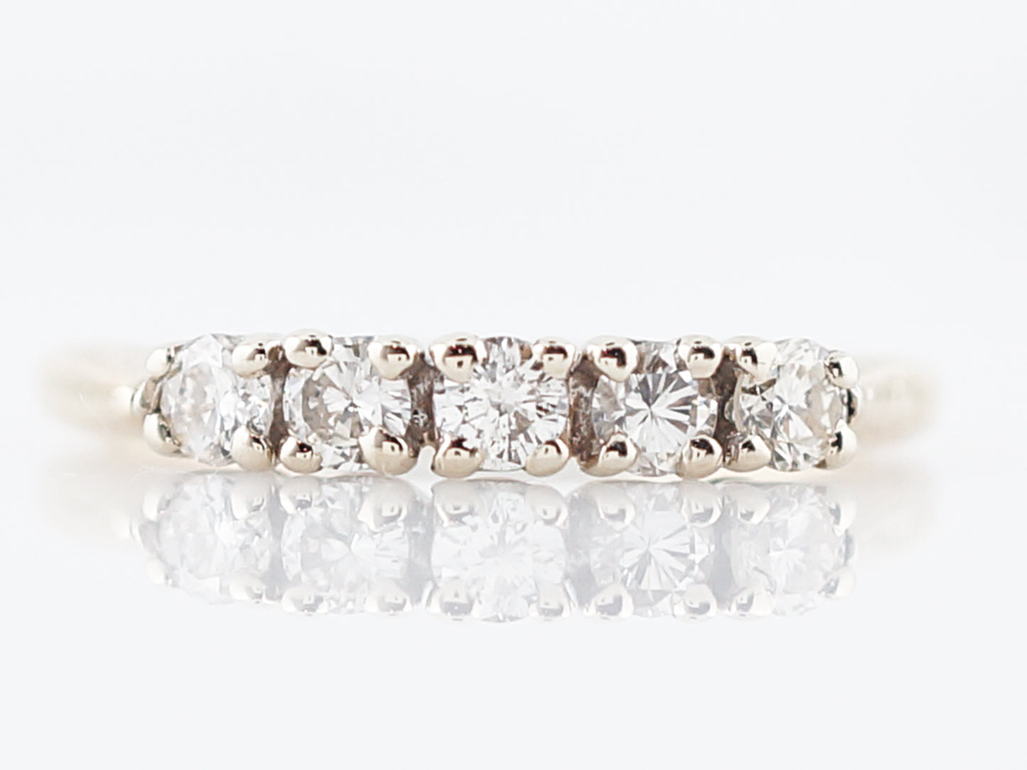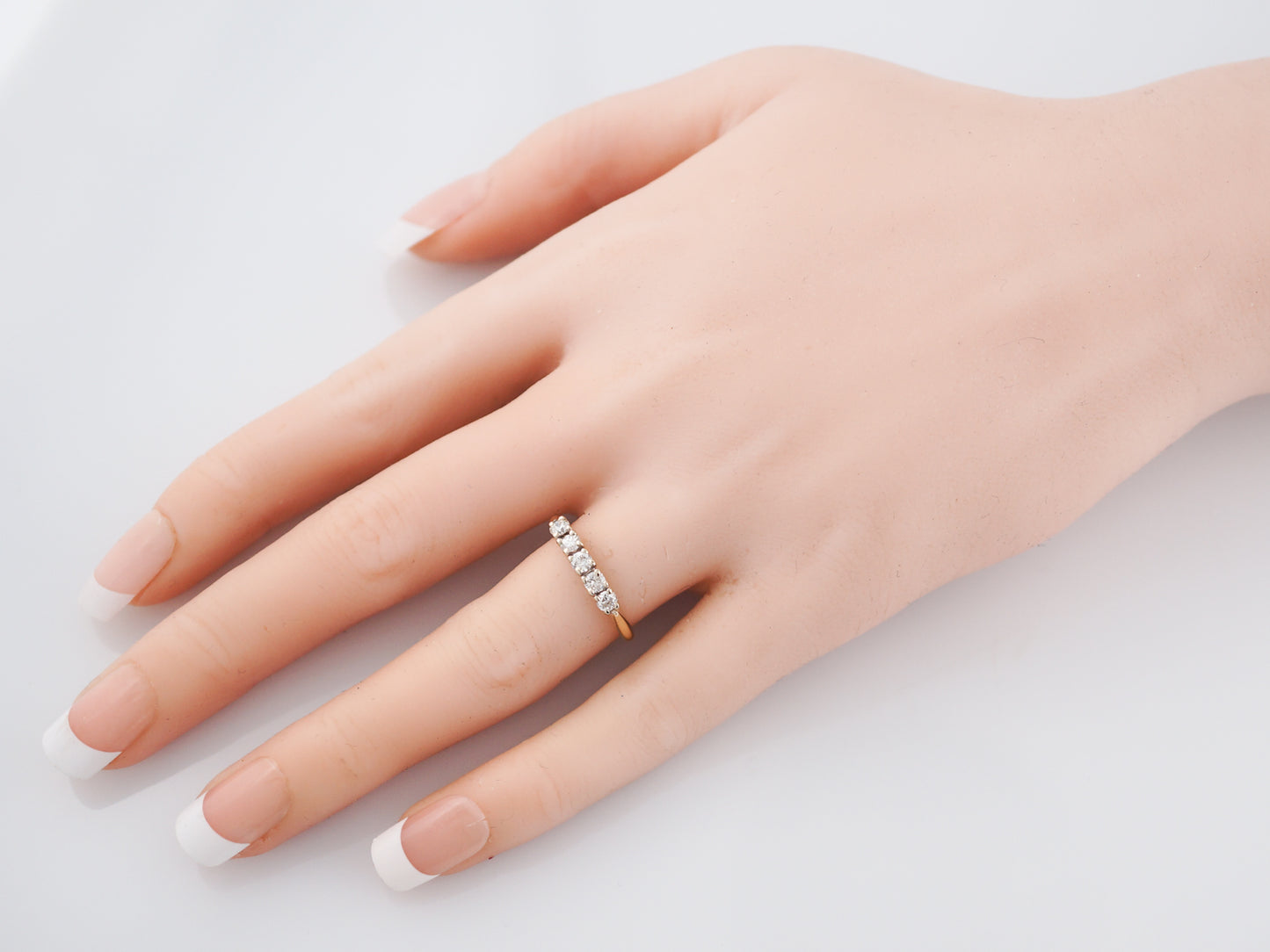 This Modern Era, five (5) diamonds wedding band has a timeless look. Five (5) diamonds are prong set into 14 karat yellow and white gold with a total weight of 0.40 carats. The band has a slight taper away from the diamonds, but the profile is fairly flat allowing it to sit flush against an engagement ring.