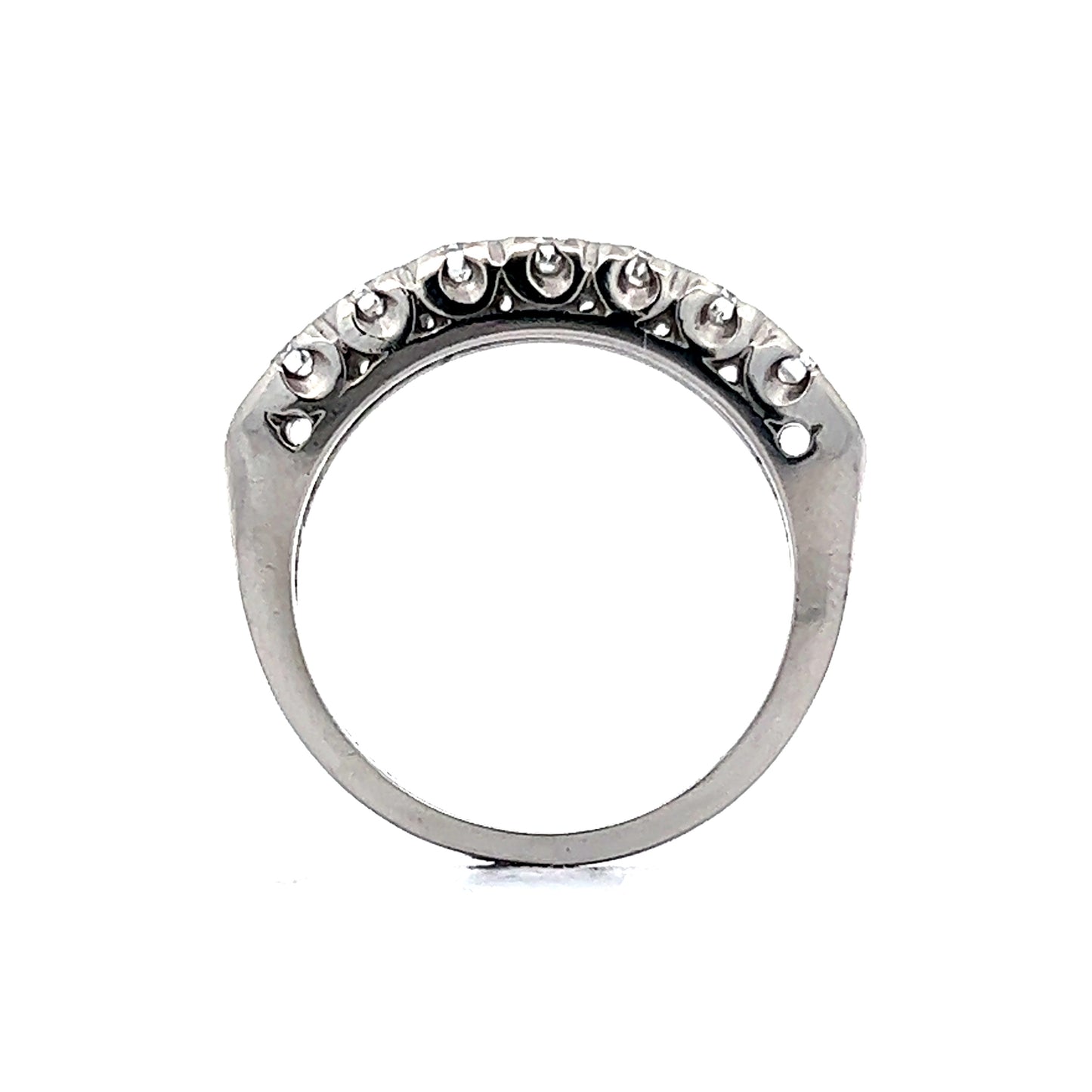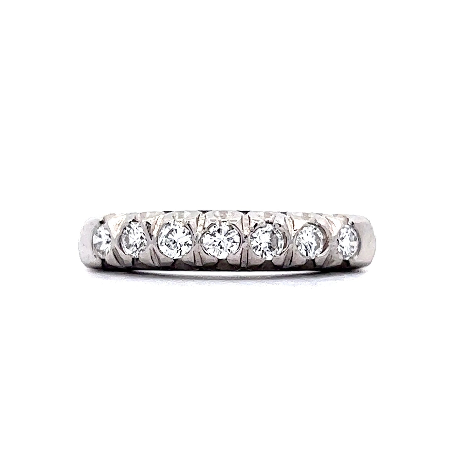 This beautiful modern platinum wedding band has quite the commanding presence. Featuring seven (7) round brilliant cut diamonds each weighing .07 carats, the diamonds are individually prong set across the face of the band finished in a knife edge. A lovely diamond anniversary band with lots of brilliance or great as a stand alone right hand ring!