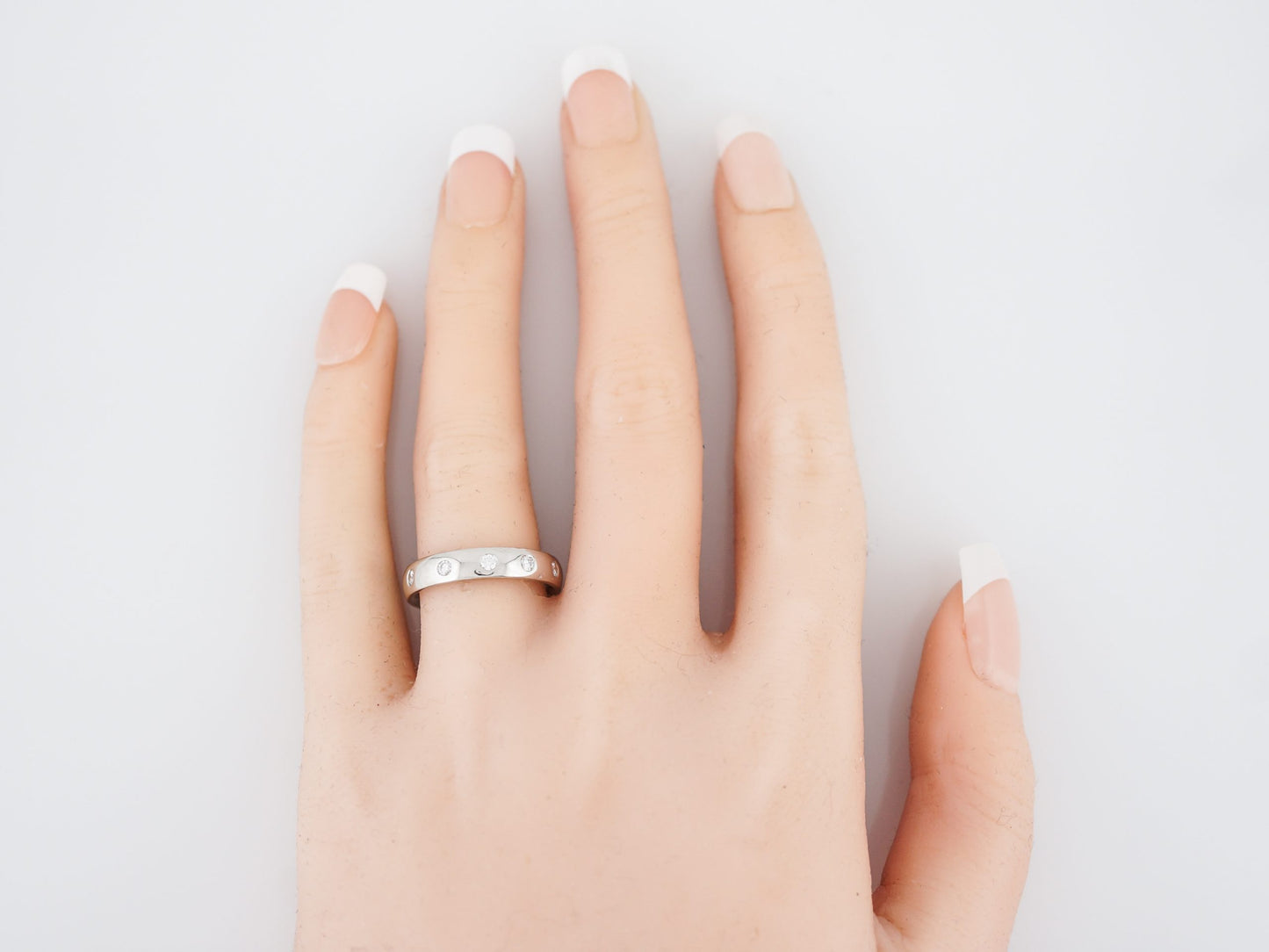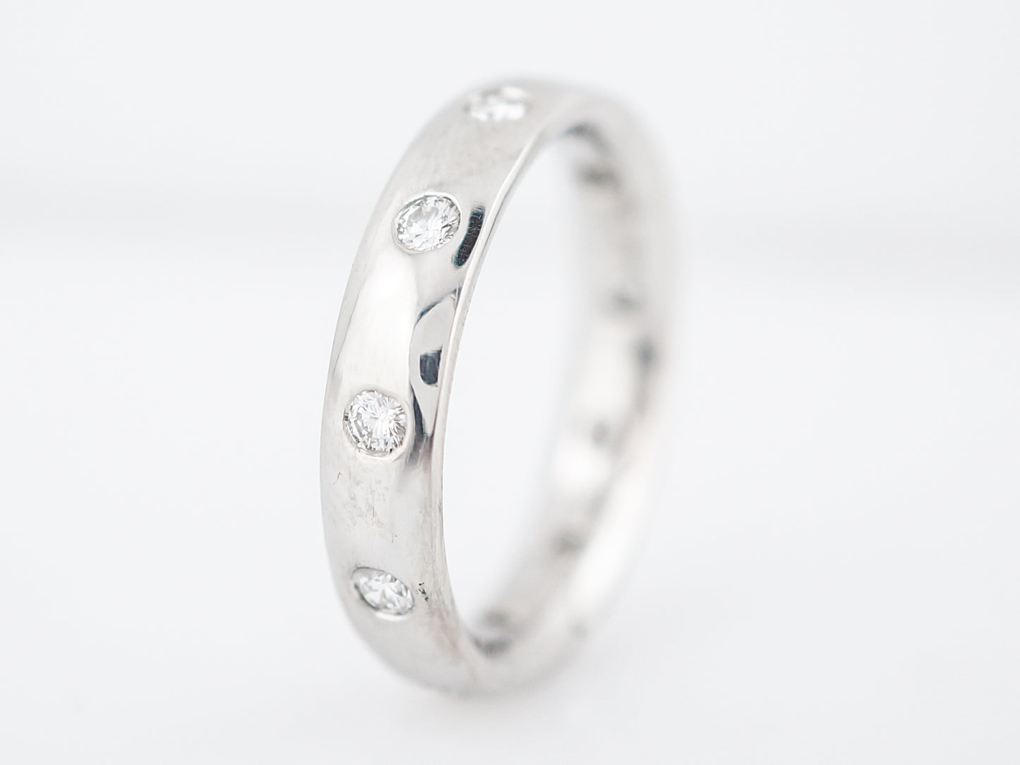 This platinum modern wedding band is a perfect example of clean lines with a touch of brilliance. The band features eleven (11) round brilliant diamonds evenly spaced around the band in an eternity design. The band has an understated refraction of light with every turn of the hand. The band is currently finished with a high polish but a brushed or satin finish could be added.