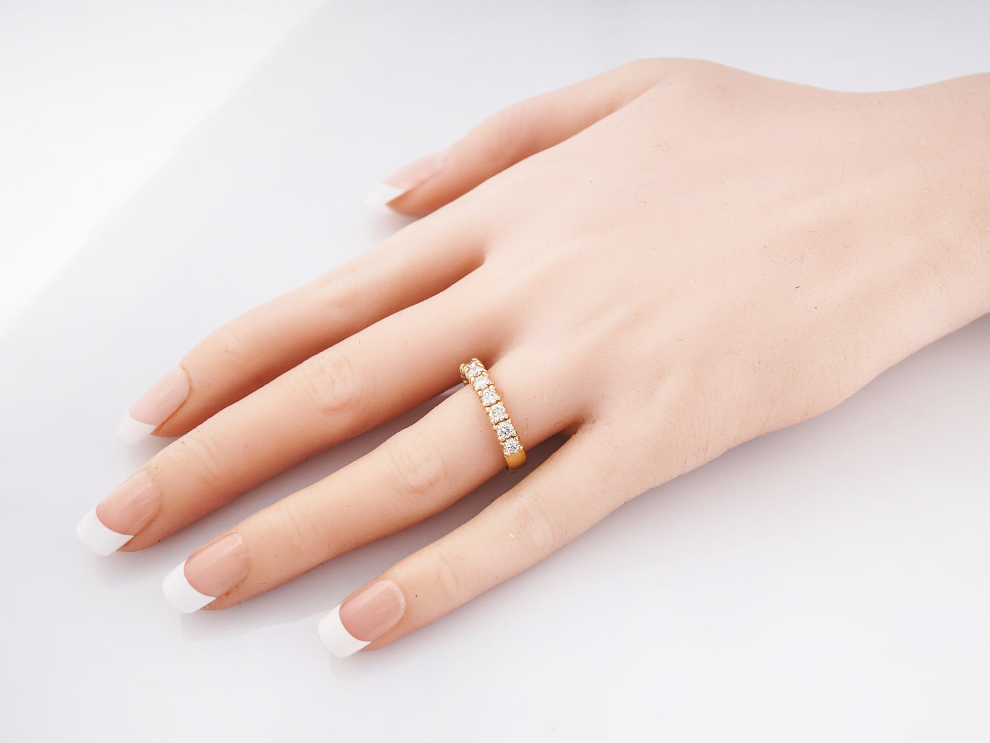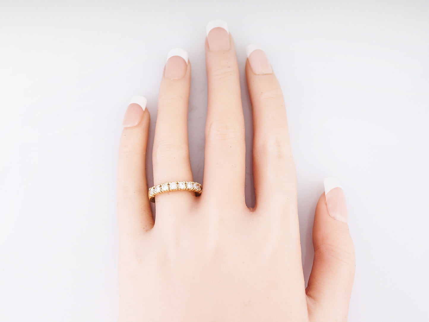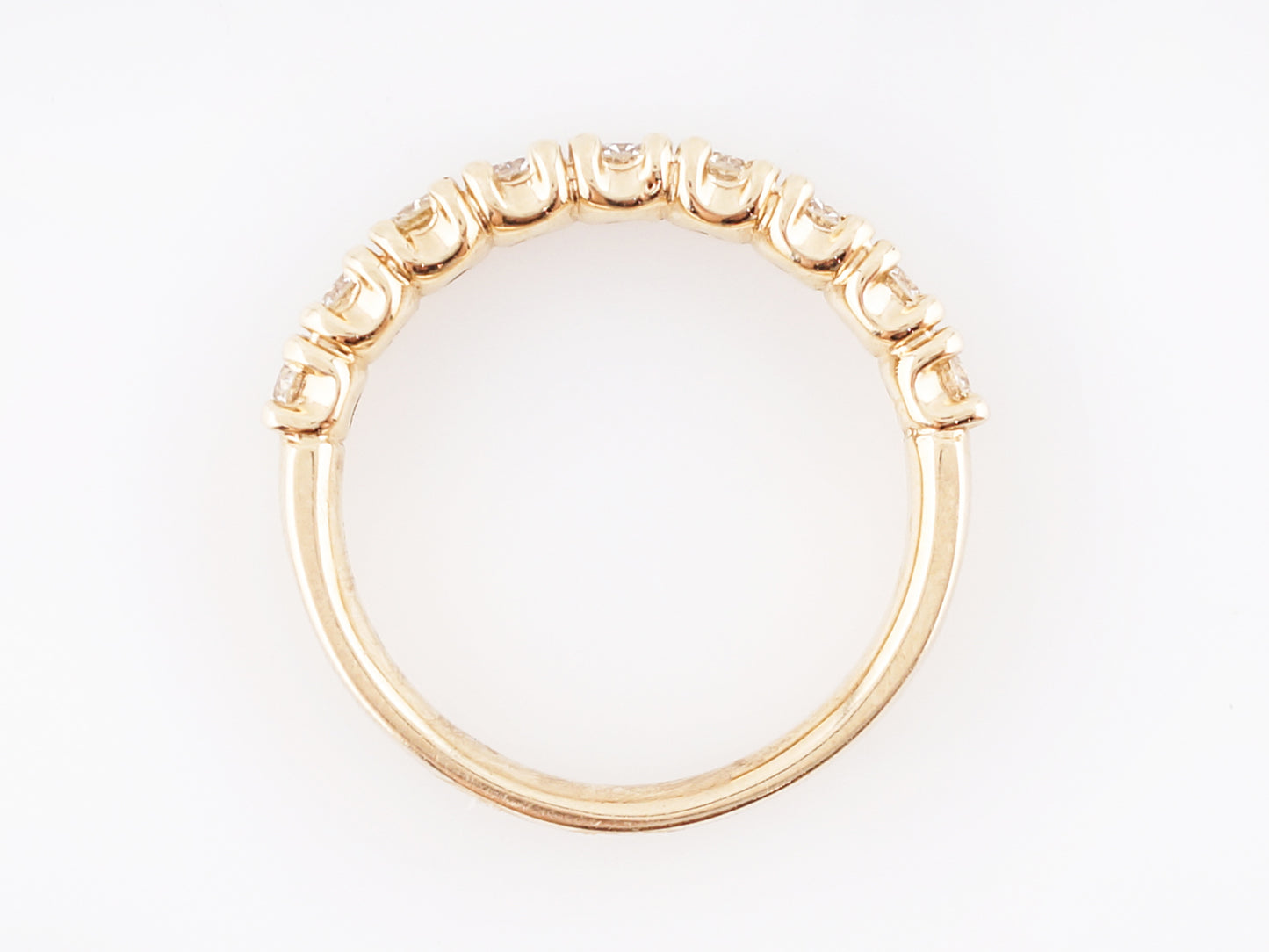 This Modern wedding band is made with .80 carat of round brilliant cut diamonds. The diamonds are prong set into the 14k yellow gold setting. The diamonds cover half of the band making it easy and comfortable to wear. This ring would make a great wedding band and would also add some sparkle to a stack of bands.