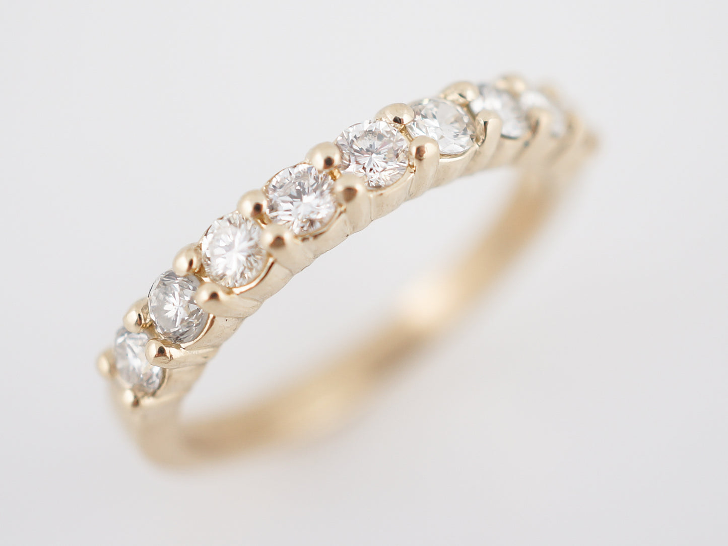 This custom wedding band features .81 carats of sparkling diamonds finished in vibrant 14 karat yellow gold. In half-eternity style, the diamonds are set across the front half of the band. The diamonds sparkle from every angle and this ring would complement any antique or modern engagement ring or stack.