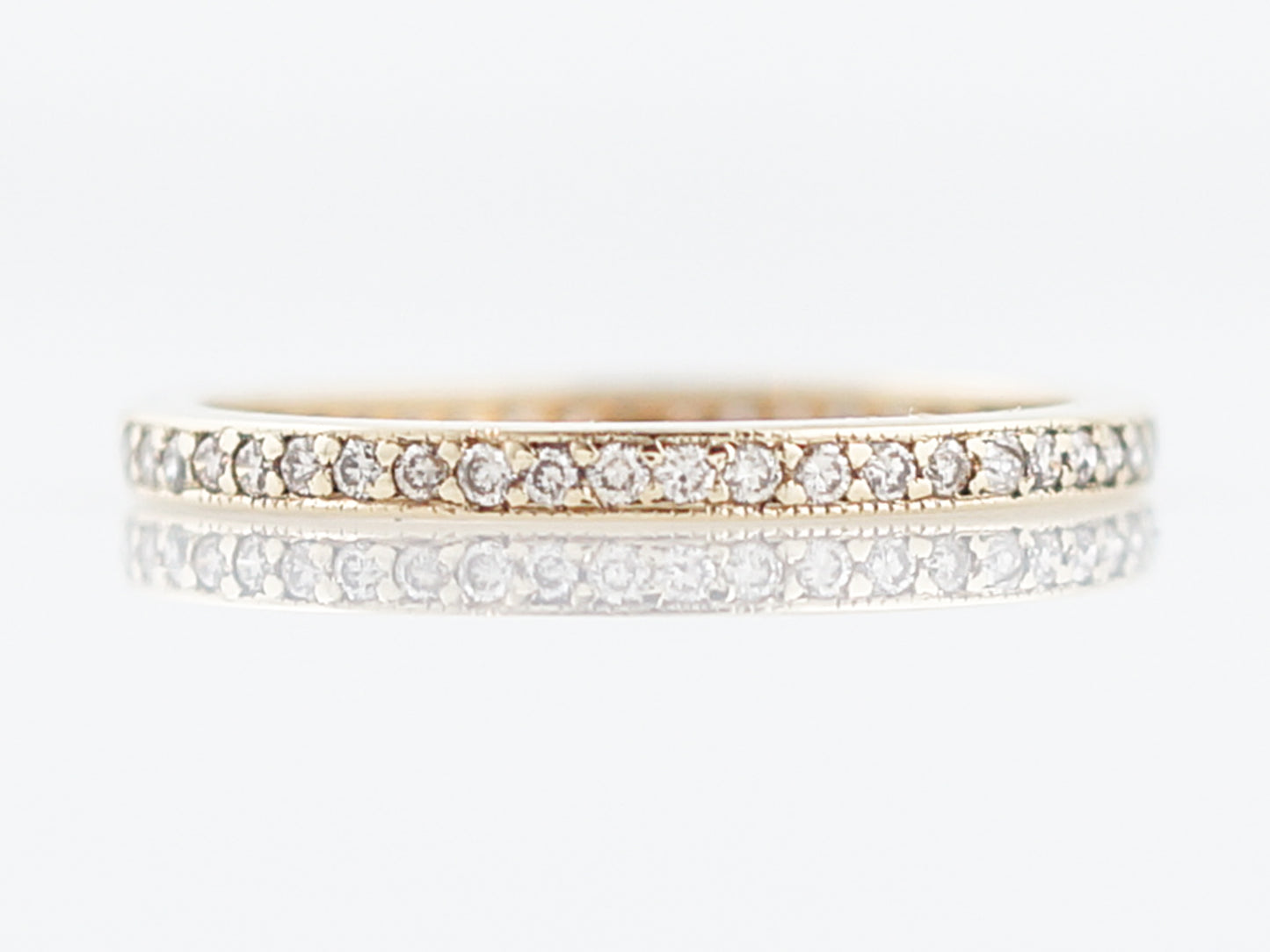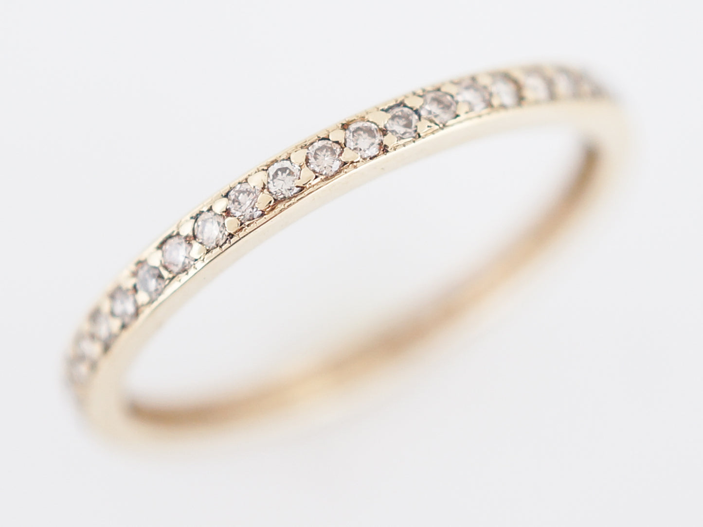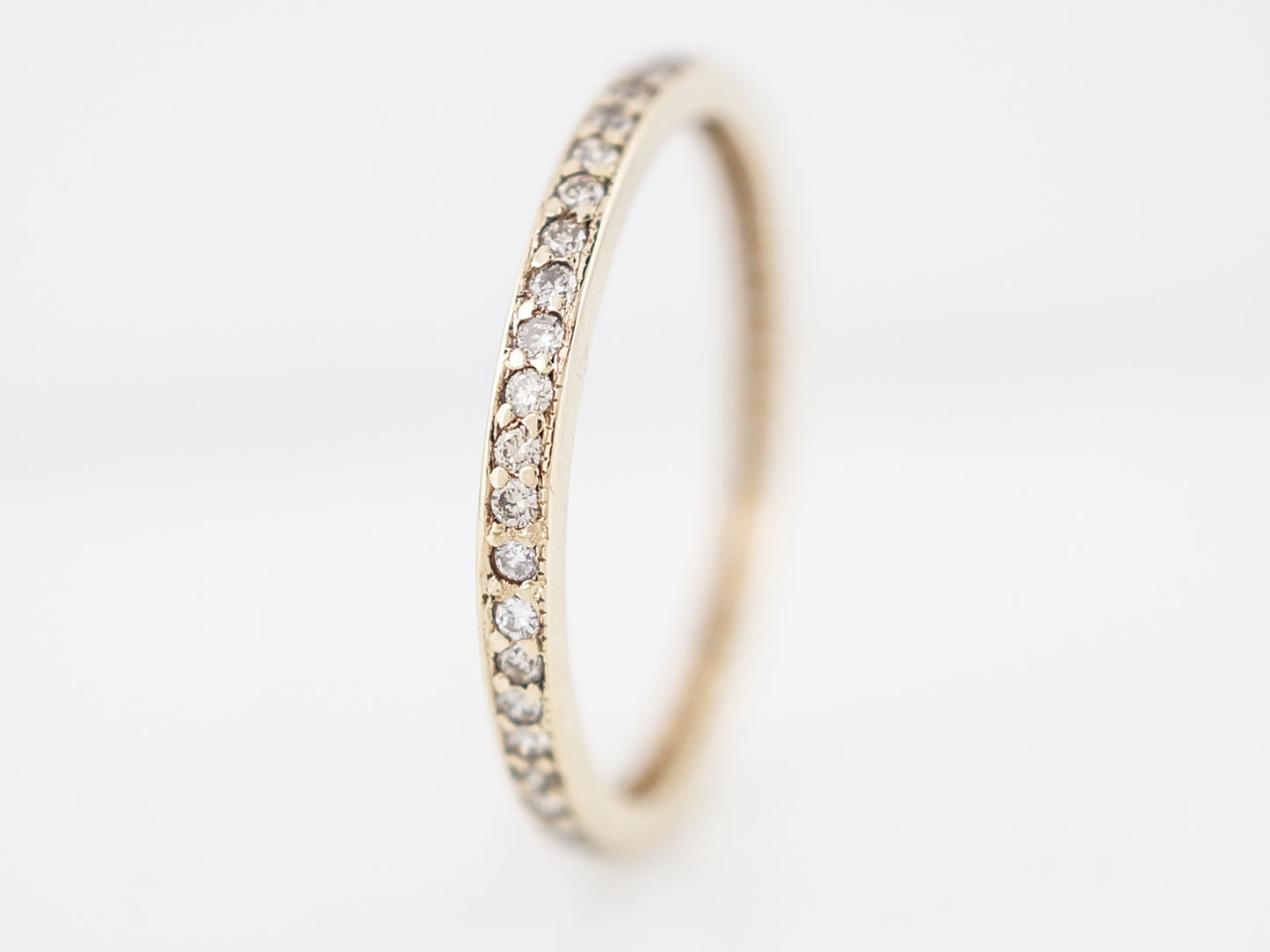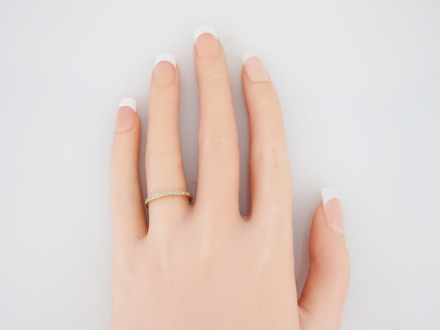 This Modern wedding band combines 14k yellow gold and round brilliant diamonds. The diamonds are bead set into the thin band that measures 1.73 mm in width. This delicate band also has a low profile so it is easy to wear.