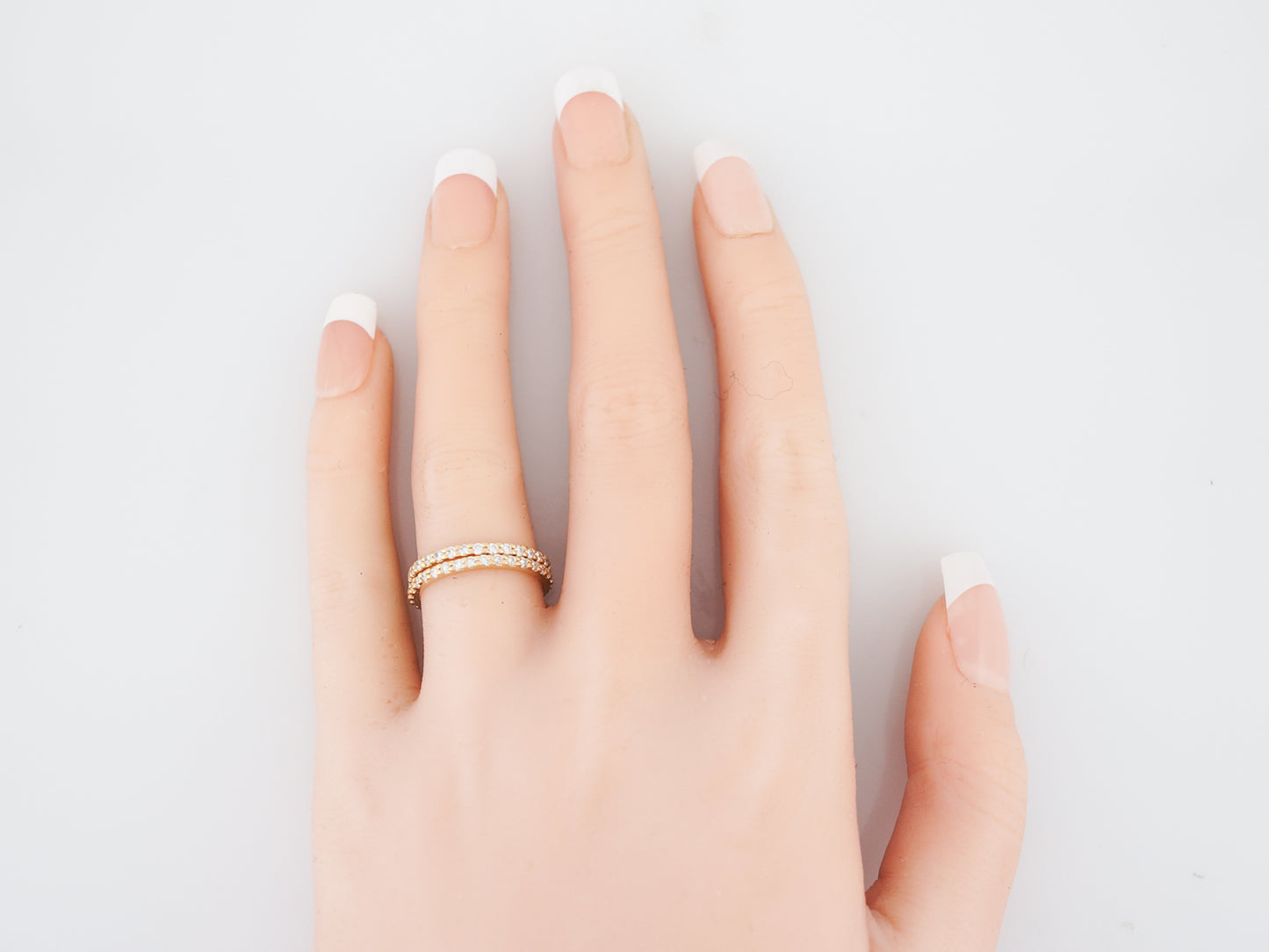 Buy one or both of these darling eternity style, 14 karat yellow gold, modern weddings bands. Made identical, these rings each have .48 carats of diamonds which go all the way around the band, and are prong set for ultimate sparkle. Just 1.65mm wide, these bands are a great size to compliment an engagement ring, we think they would look just darling to pair one on each side. Please note: there are two available, pricing is for ONE ring.