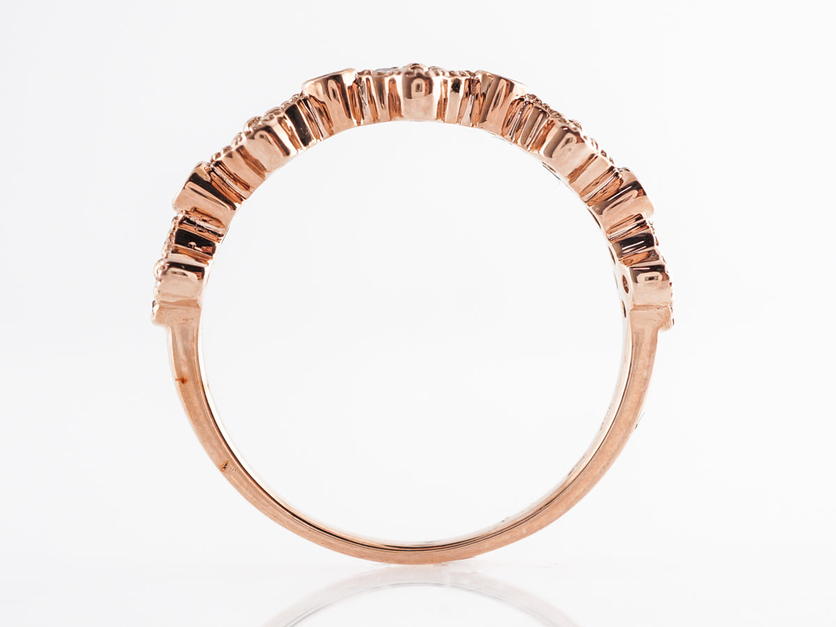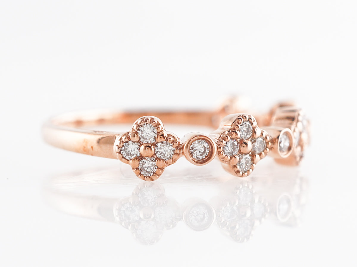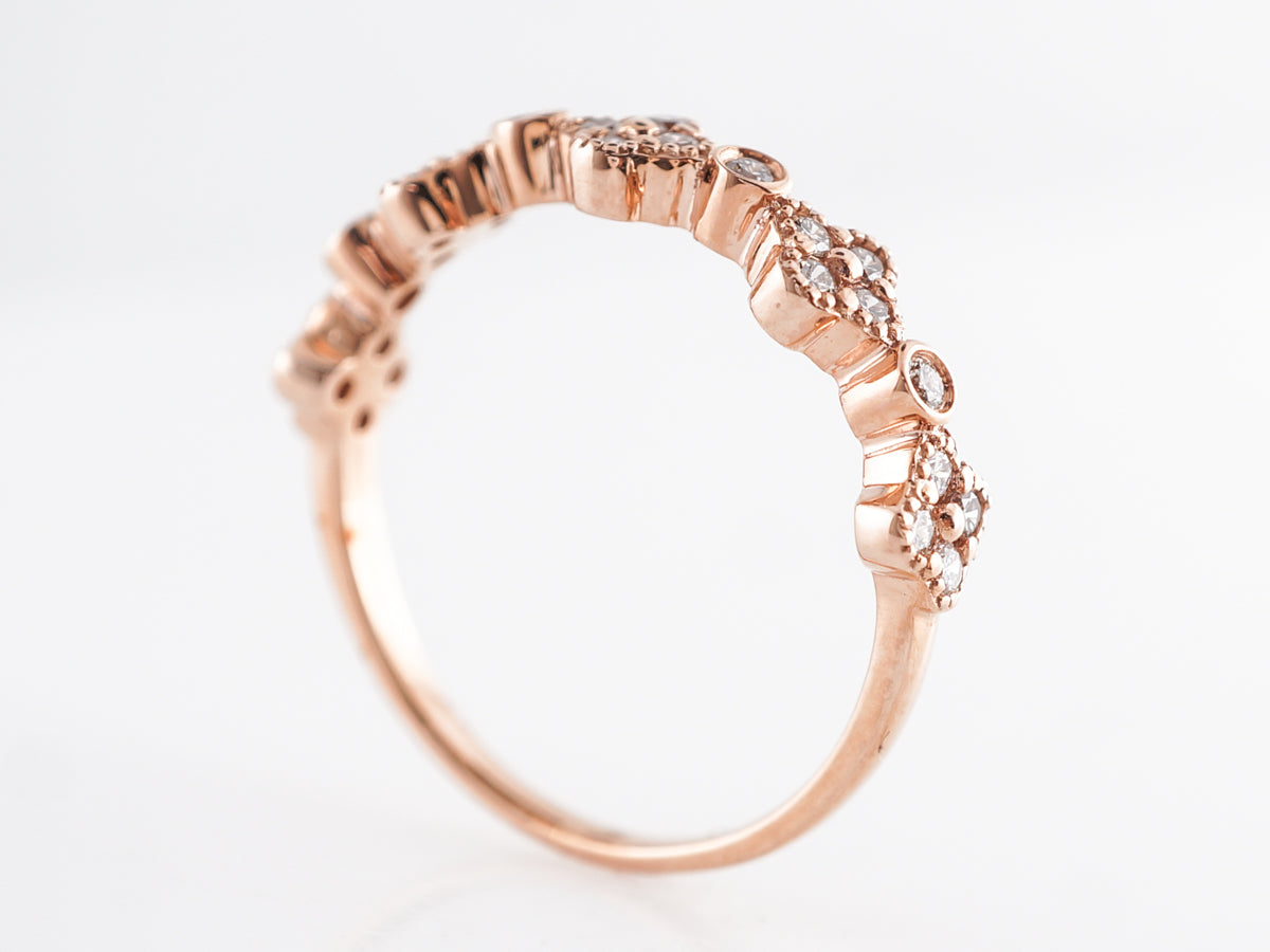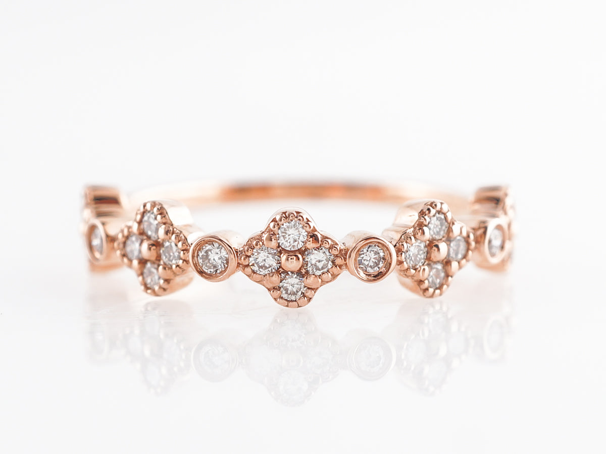 Wedding Band w/ .30 Carats of Diamonds in 14k Rose Gold. This delightful wedding band features .30 carats of round brilliant cut diamonds set in 14 karat rose gold. The design shows little clusters spaced across the top of the band with milgrain detail mixed in. This could be a great ring for a stack!