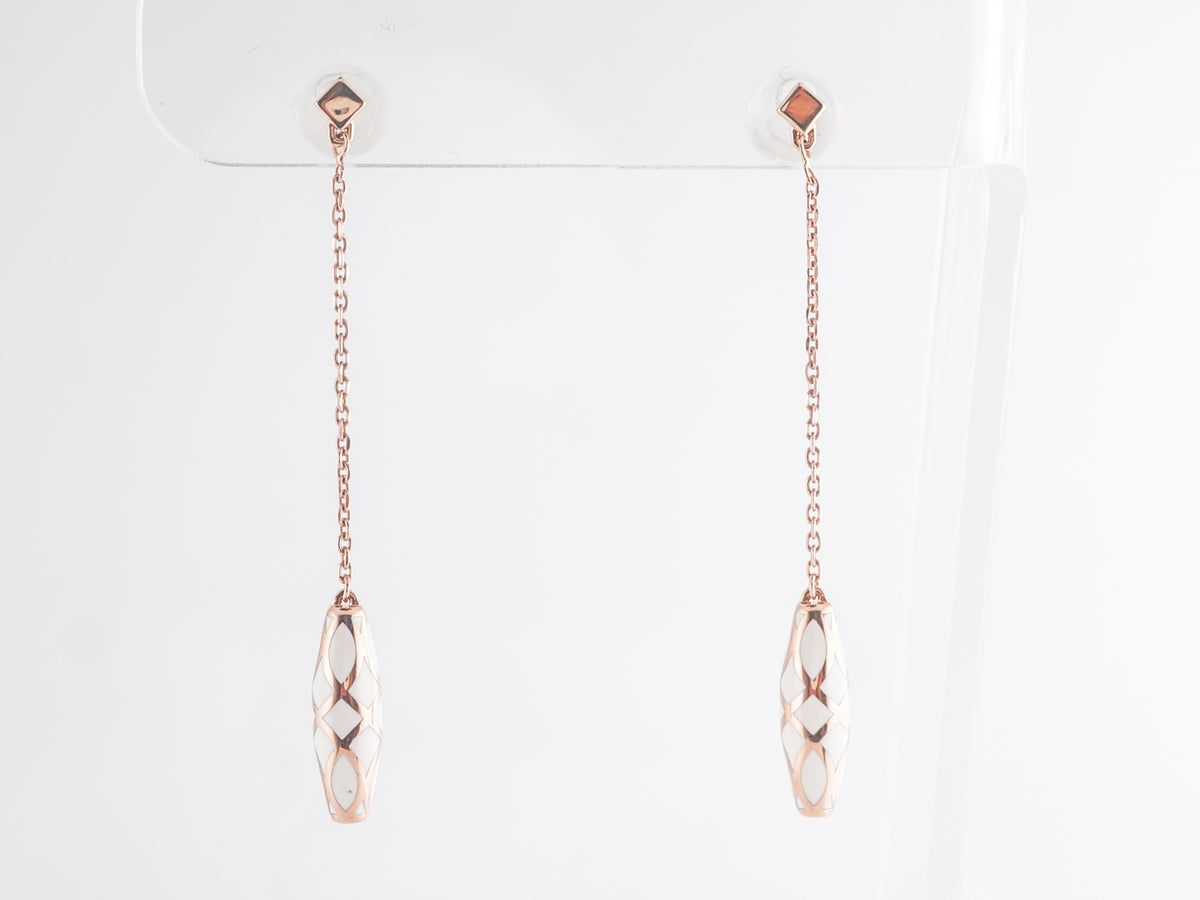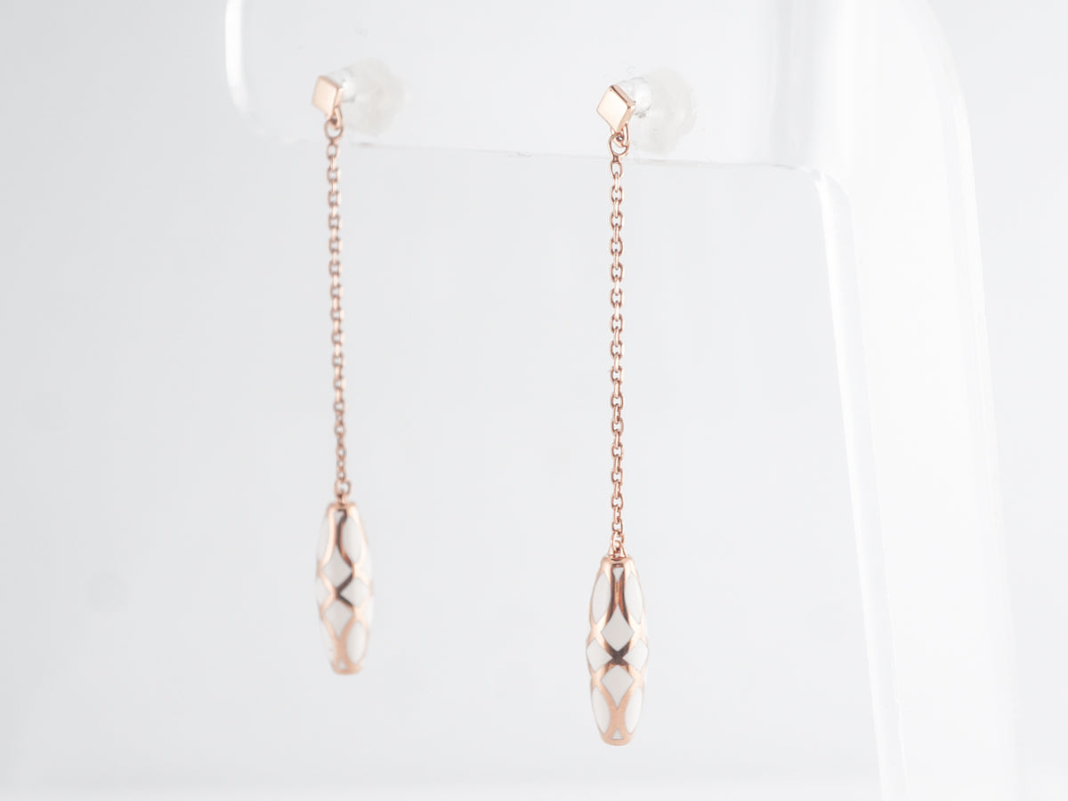 White Enamel Drop Earrings in 14k Yellow Gold. These chain drop earrings are finished in 14 karat rose gold with white enamel enhancing their beauty. The thin chain measures two inches from ear, and give plenty of movement. The long thin design with elegant enamel painted details is sure to be noticed.