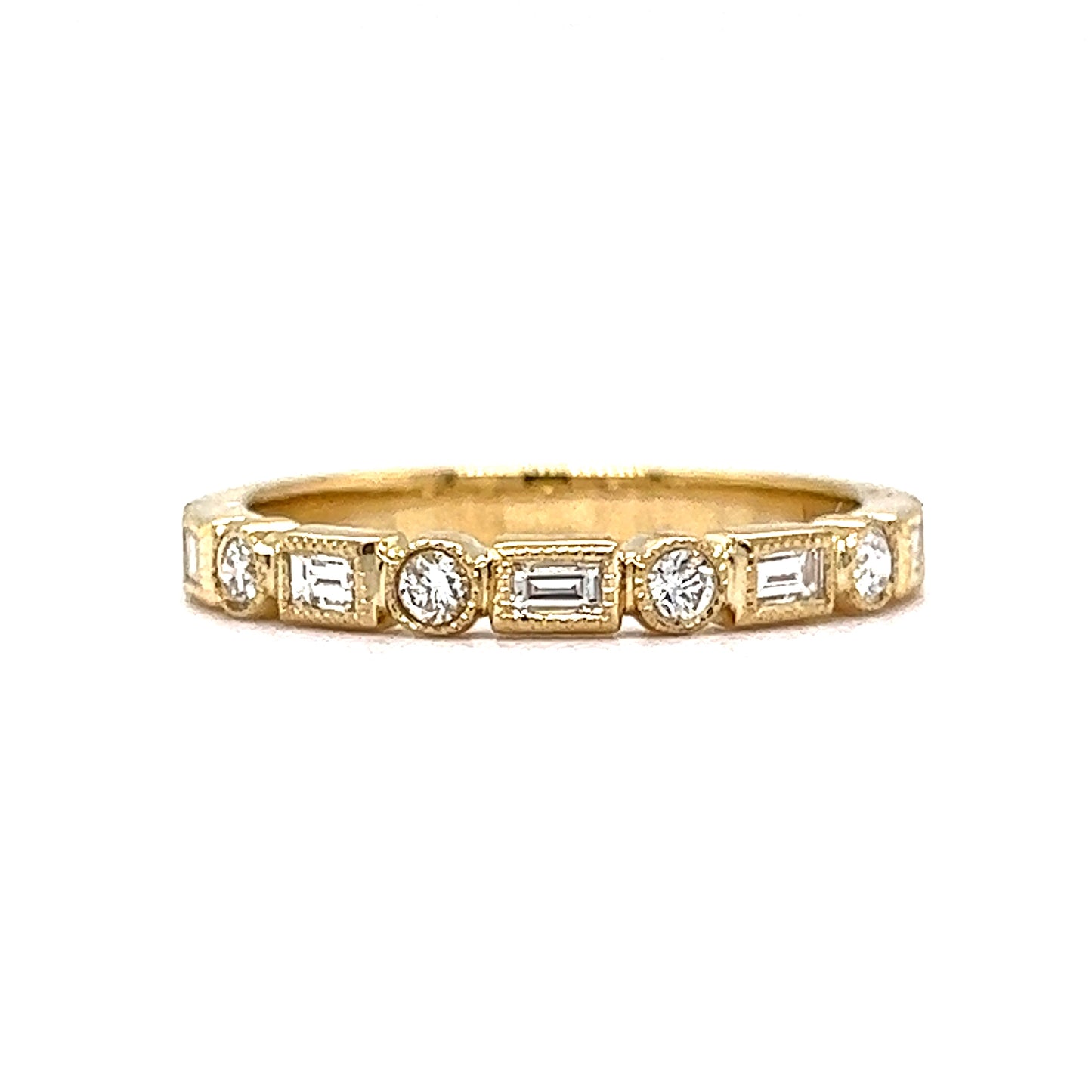 Yellow Gold Baguette Cut Diamond Wedding Band in 14k. This modern wedding band features .31 carats of baguette and round brilliant cut diamonds set in 14 karat yellow gold. The diamonds cover the top half of the ring and are bordered in fine milgrain detail. This would make a great addition to your stack or a way to add sparkle to your engagement ring!
