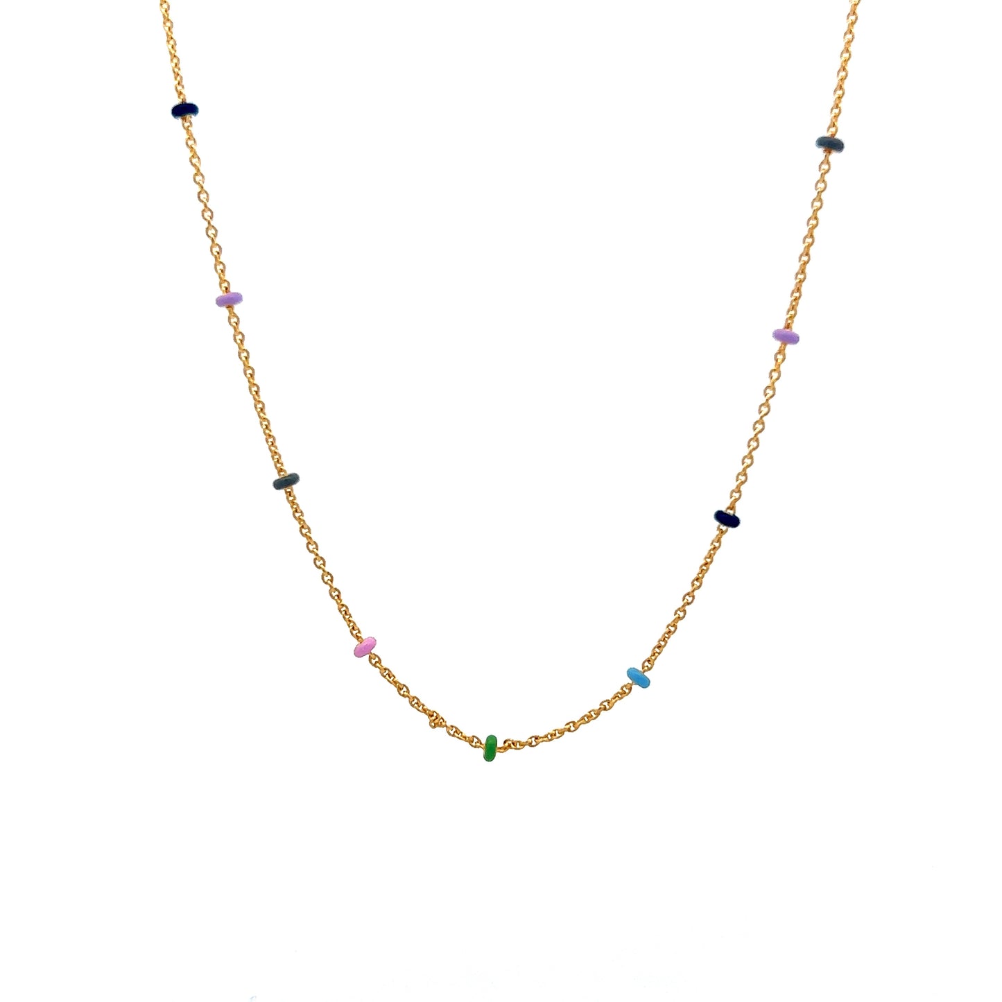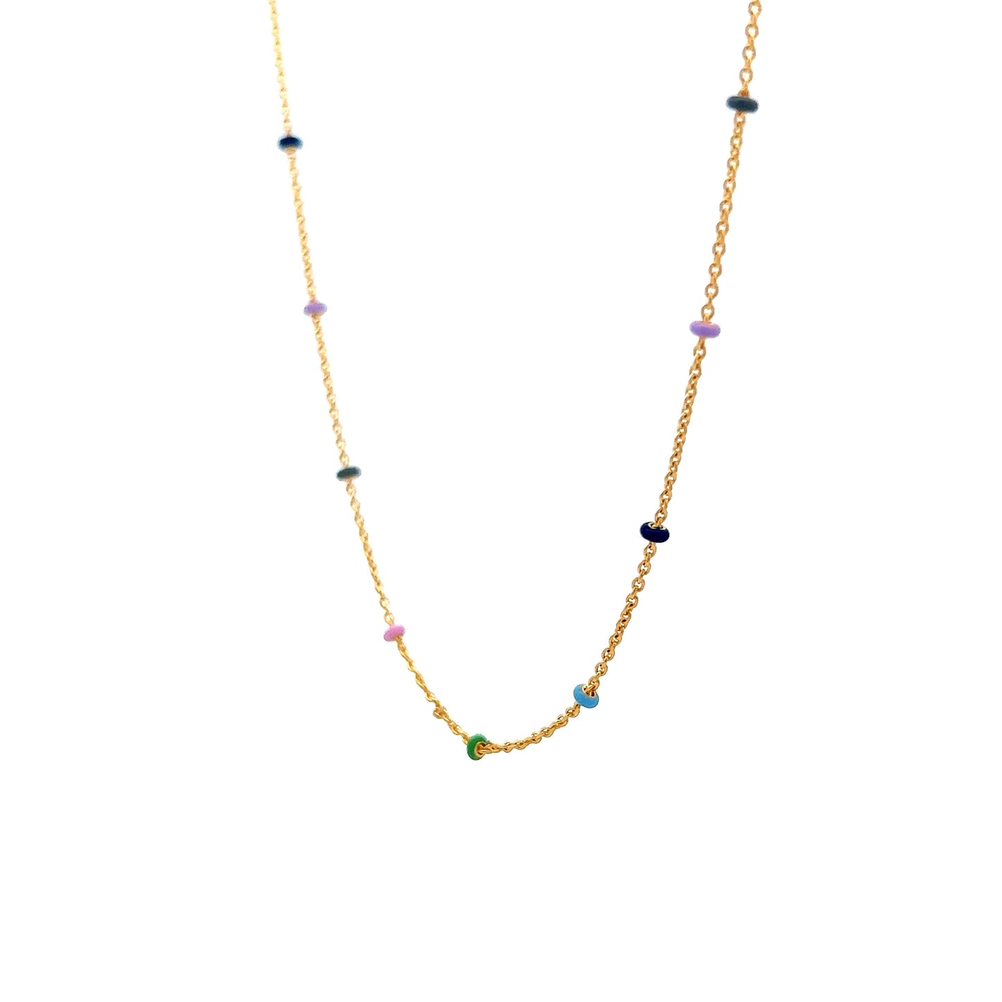 This modern chain necklace is crafted with 14 karat yellow gold and features multi-colored enamel beads for a unique and modern look. The necklace details pair perfectly with the colorful beads, making it a versatile piece that can be dressed up or down. The necklace measures 18 inches long, and is finished in 14 karat yellow gold for a beautiful shine. A stunning accessory to add to any jewelry collection!