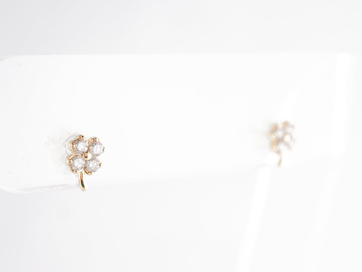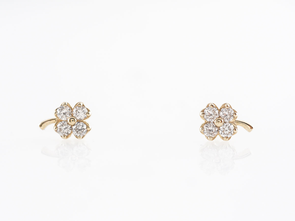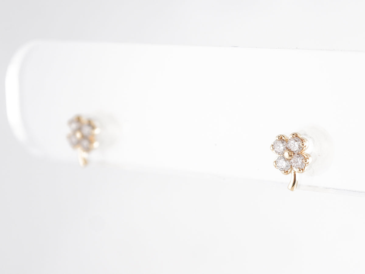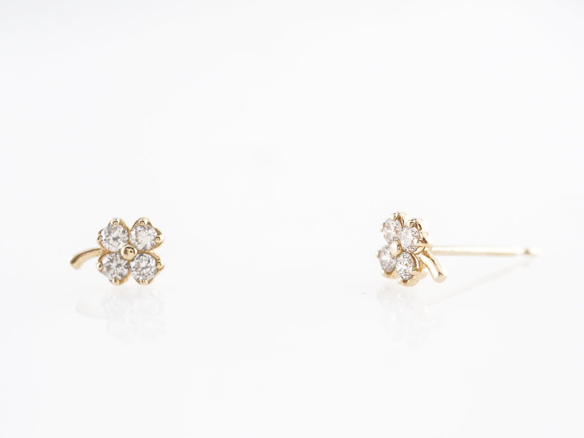 Yellow Gold Clover Earrings w/ Round Brilliant Diamonds. These adorable clover earrings feature .22 carats of round brilliant cut diamonds set in 14 karat yellow gold. The four leaf clover design sections neatly hide the prongs holding each diamond. These little beauties should bring you luck and joy, and are perfect for everyday wear.