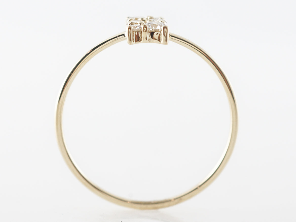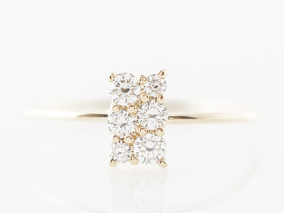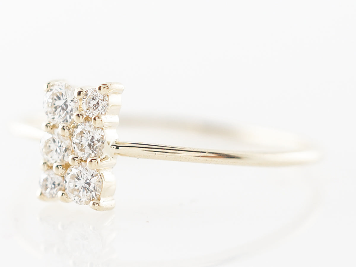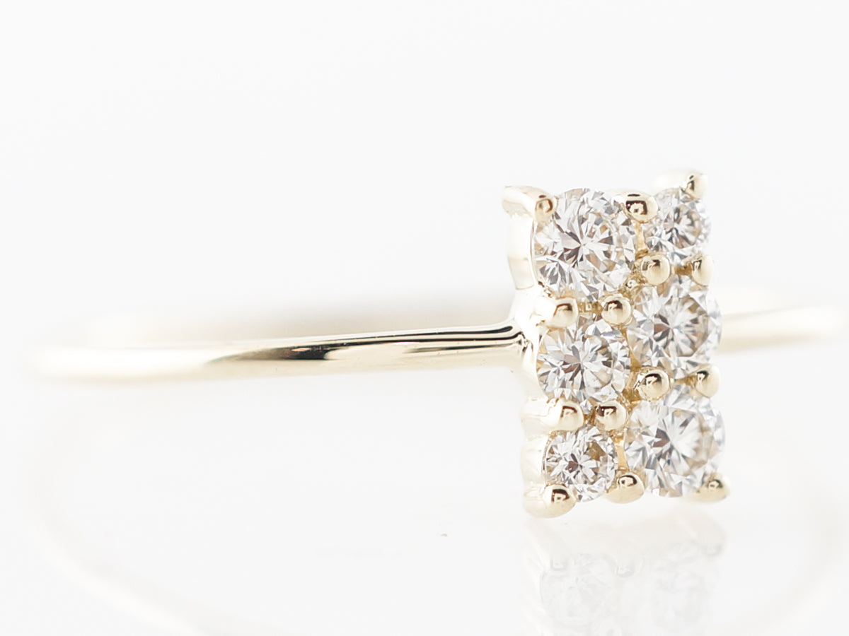 Yellow Gold Diamond Cluster Ring in 14k. This delicate diamond cluster ring in 14 karat yellow gold features six (6) round diamonds of different sizes bead set, totaling .19 carats. The stones are arranged in offset positions that together form a rectangle. The design provides a simple sparkle at a glance, and an interesting complex layout upon closer look.