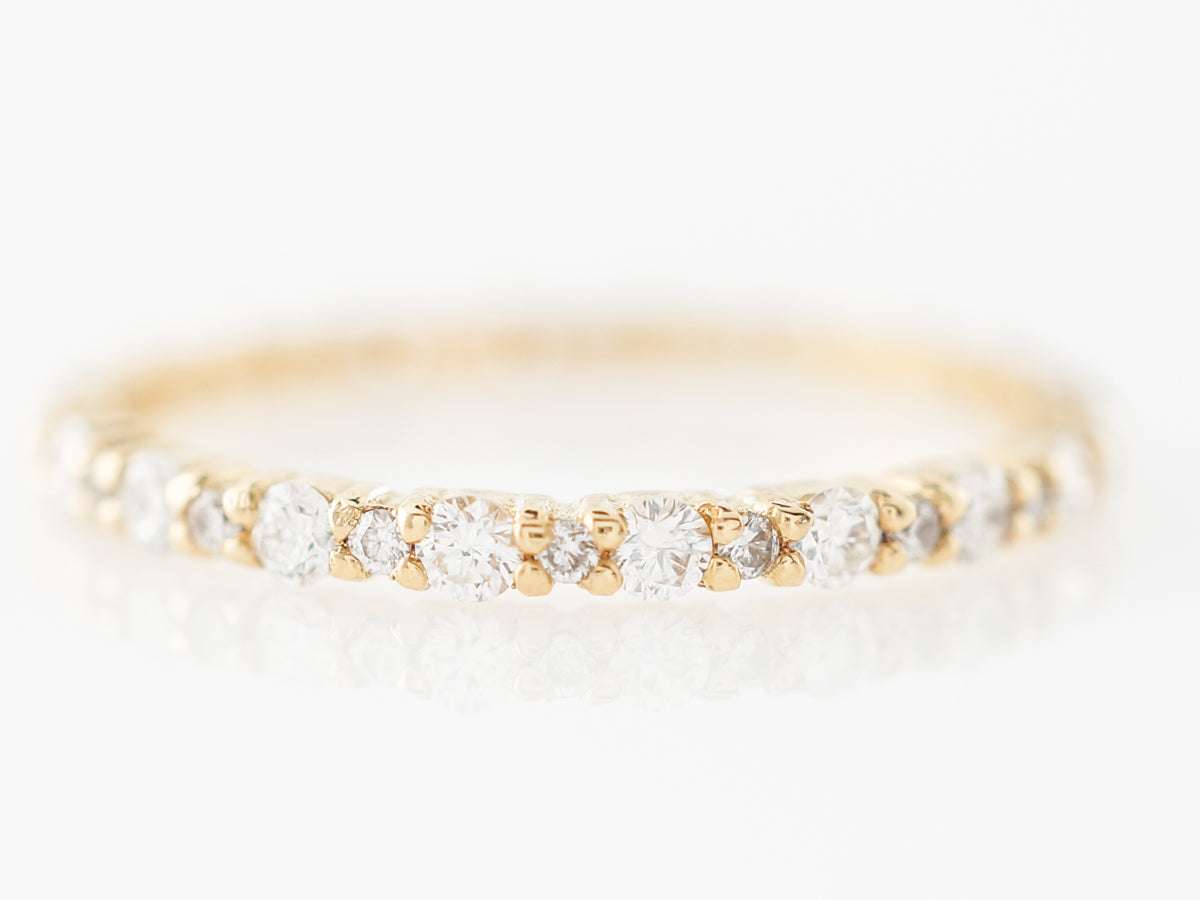 Yellow Gold Diamond Eternity Wedding Band 18k. This modern eternity wedding band contains forty (40) round brilliant cut diamonds totaling .55 carats. The diamonds are bead set in 18 karat Yellow gold. This ring can be the perfect accompaniment to either a modern or antique engagement engagement ring.