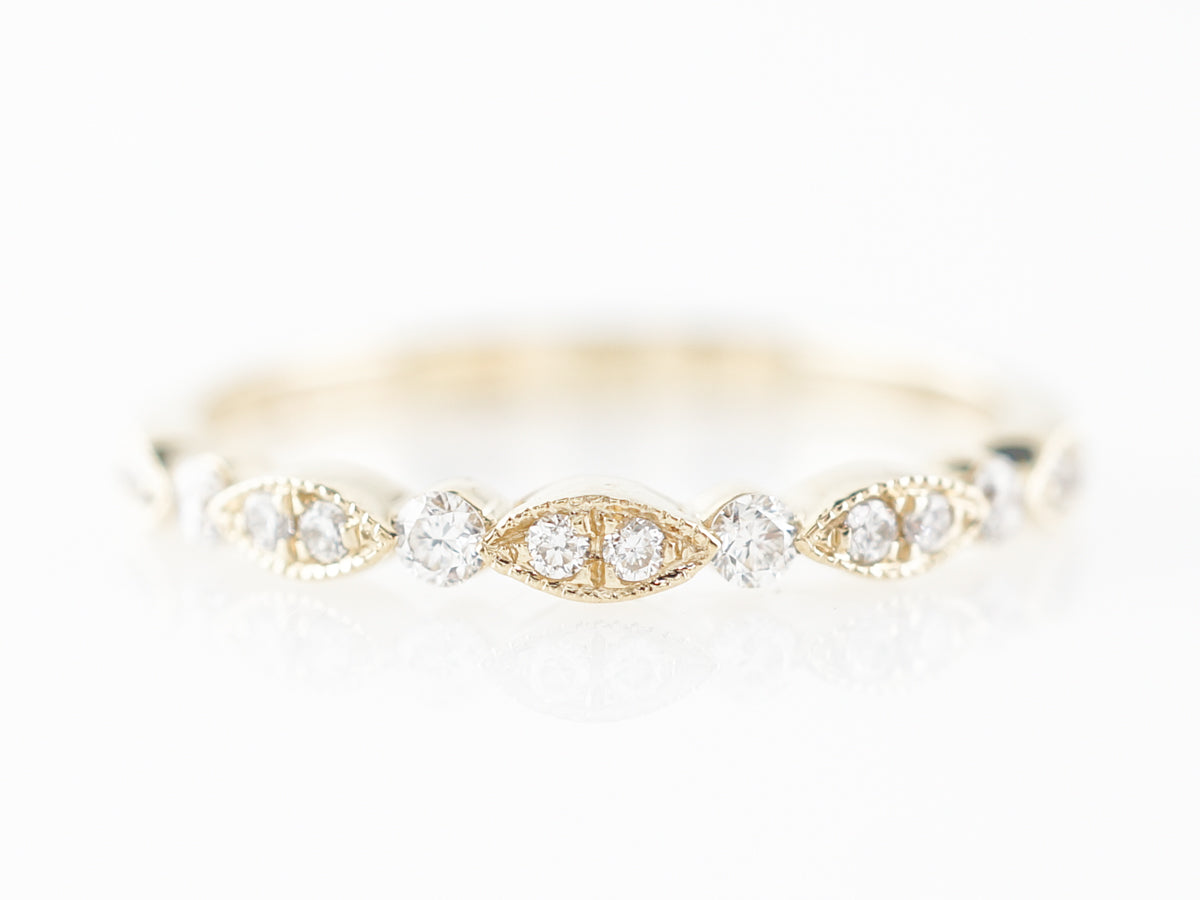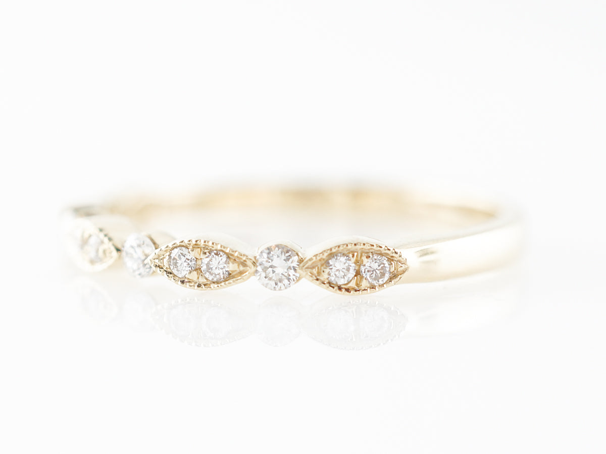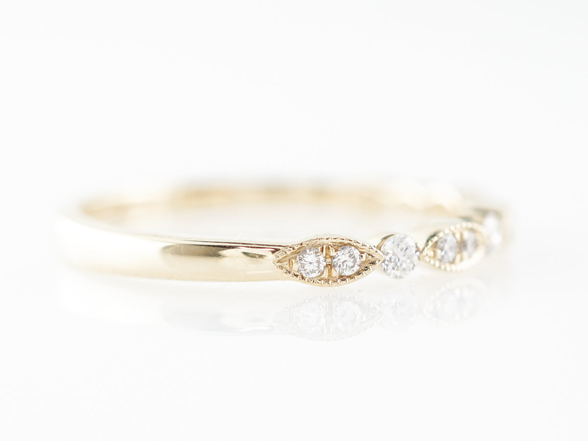 Yellow Gold Diamond Milgrain Wedding Band in 14k. This modern wedding band features .16 carats of round brilliant cut diamond set across the top of the band in 14 karat yellow gold. The graduated sized diamond give the ring a gorgeous geometric feel and the light milgrain edging provides the texture. This ring will pair nicely with an engagement ring or in a stack of bands.