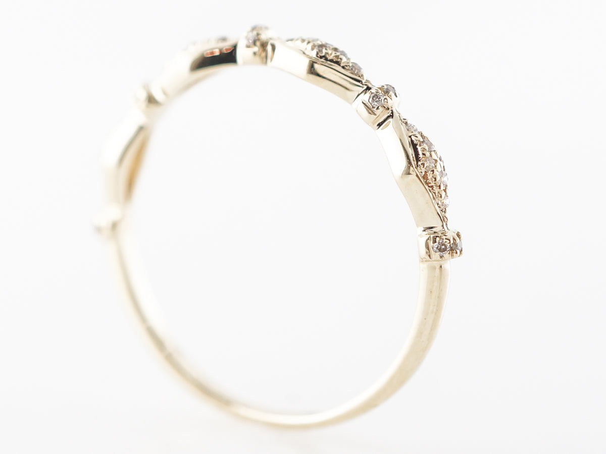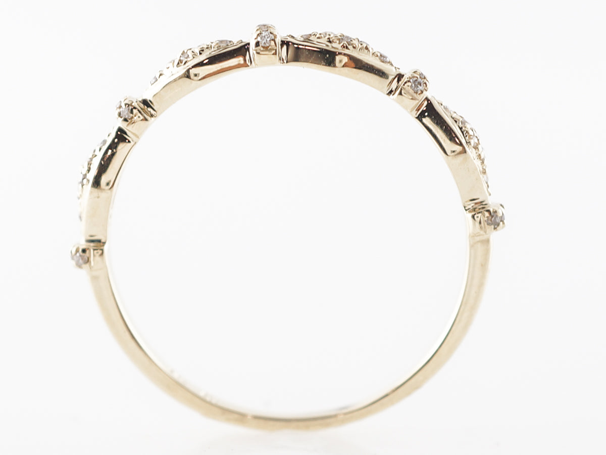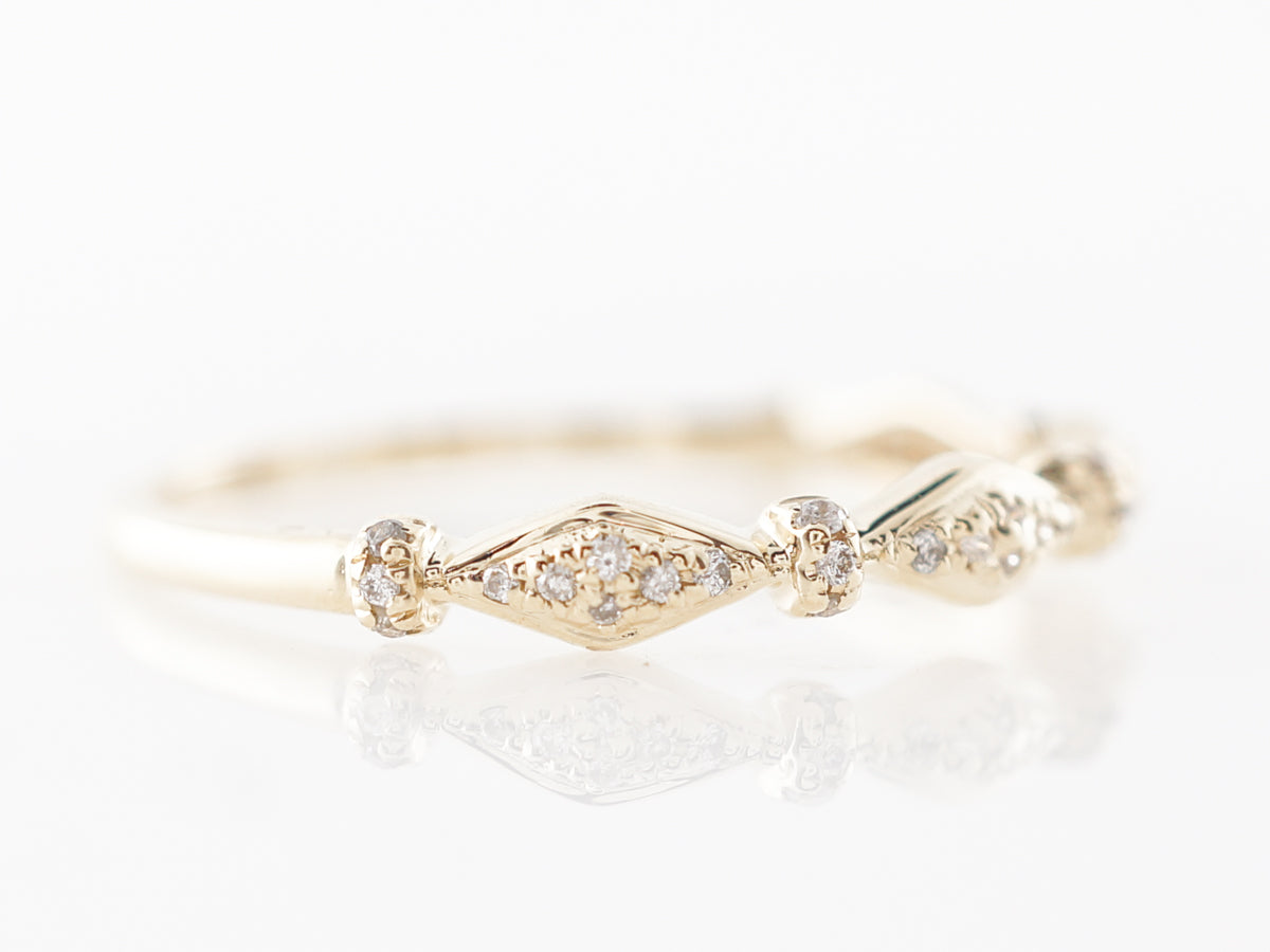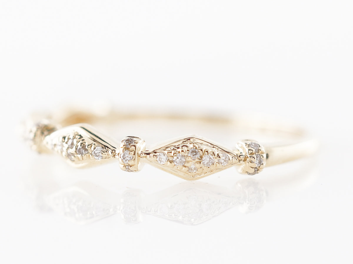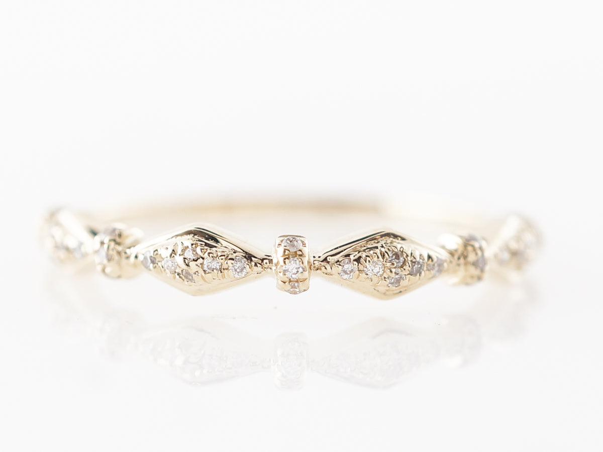 Yellow Gold Diamond Wedding Band 14k Modern. This modern wedding band features .078 carats of round brilliant cut diamond set across the top of the band. The repeating shapes in 14 karat yellow gold give a gorgeous geometric feel. This ring will pair nicely with an engagement ring or in a stack of bands.