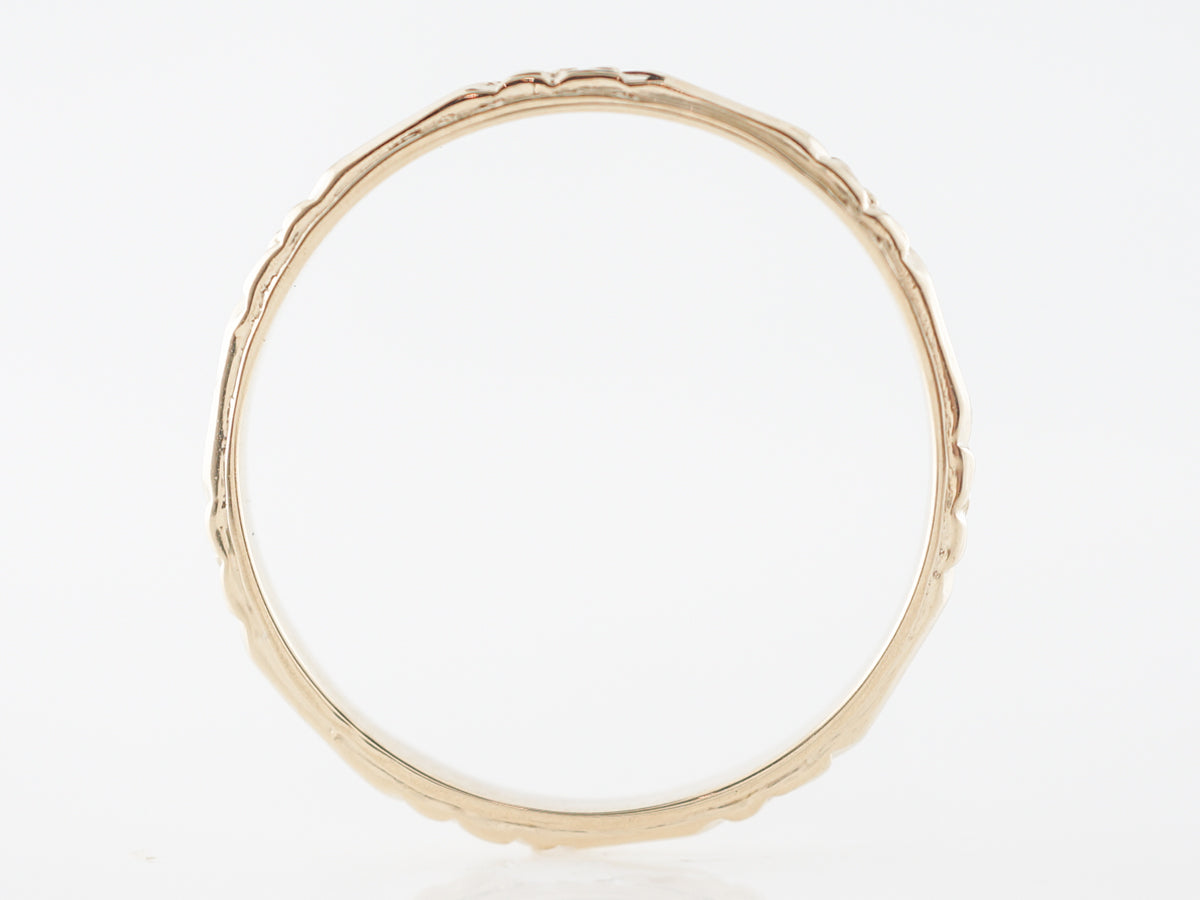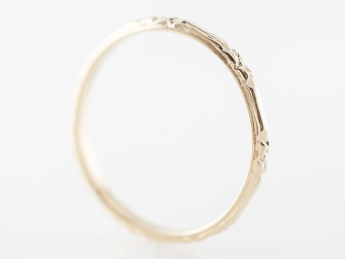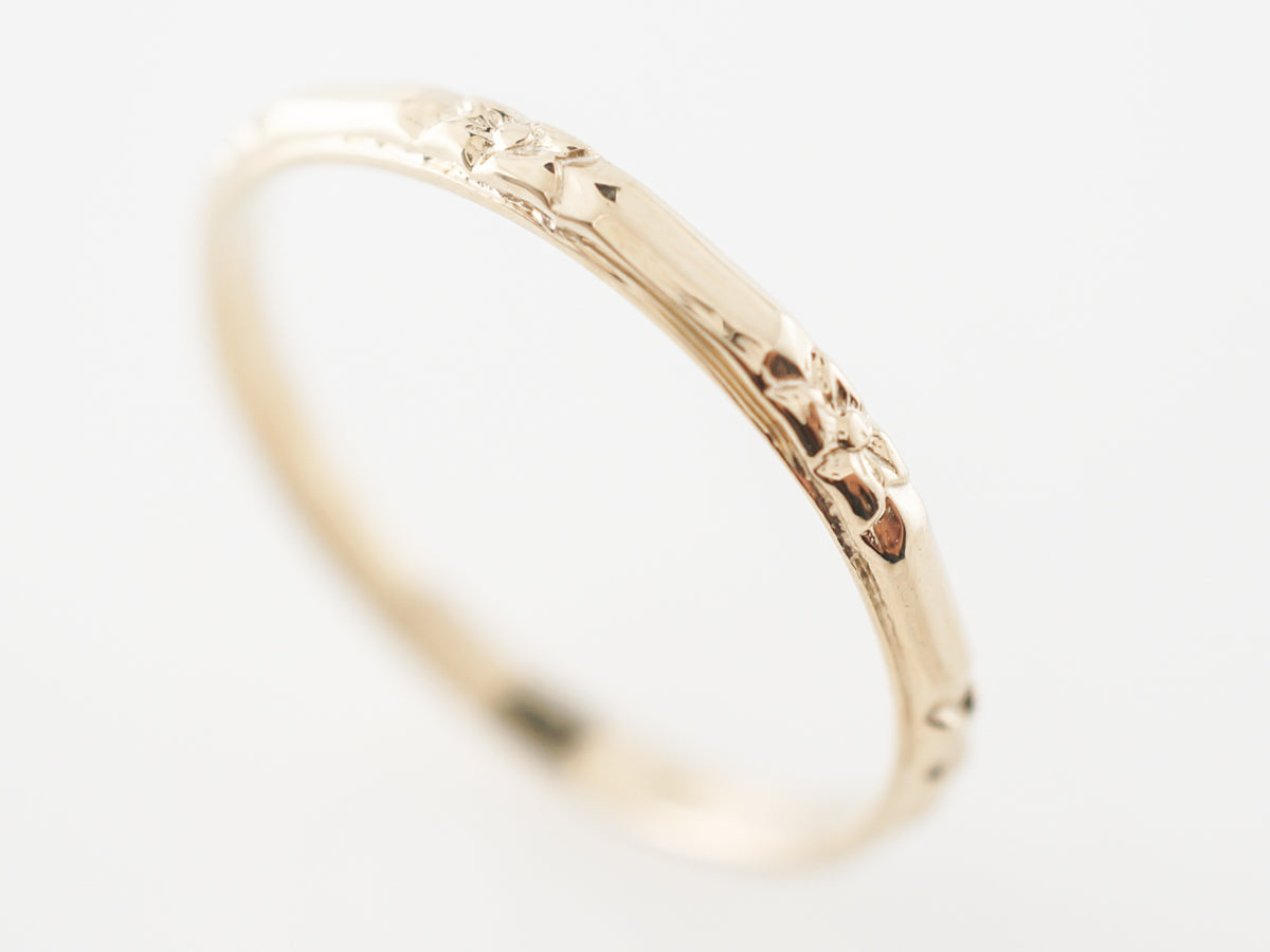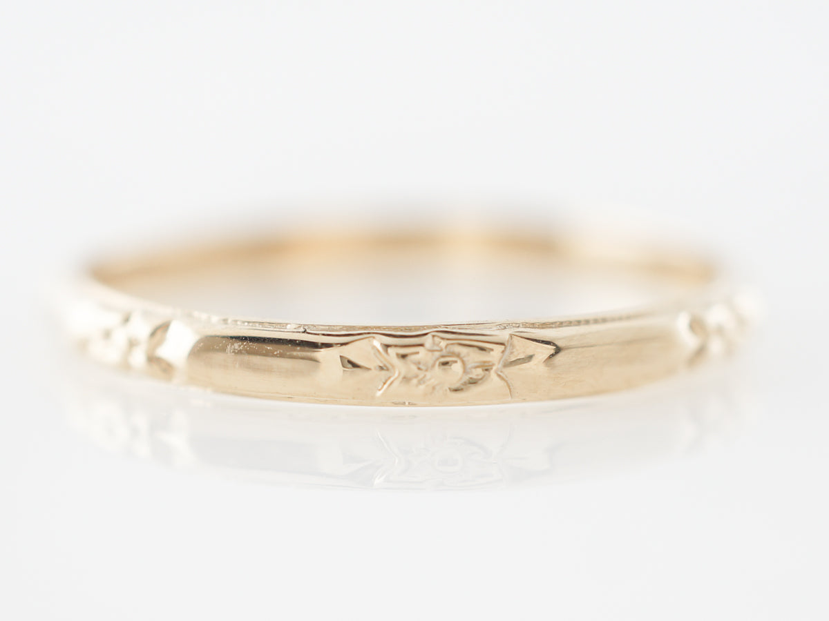 Yellow Gold Orange Blossom Wedding Band in 14k. This modern engagement ring is a reproduction of an art deco wedding band. Finished in 14k yellow gold, this band features orange blossom patterns interspersed around the entirety of the band. This band would pair wonderfully with a yellow gold engagement ring.