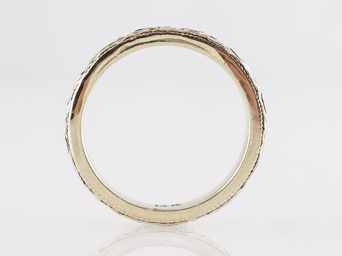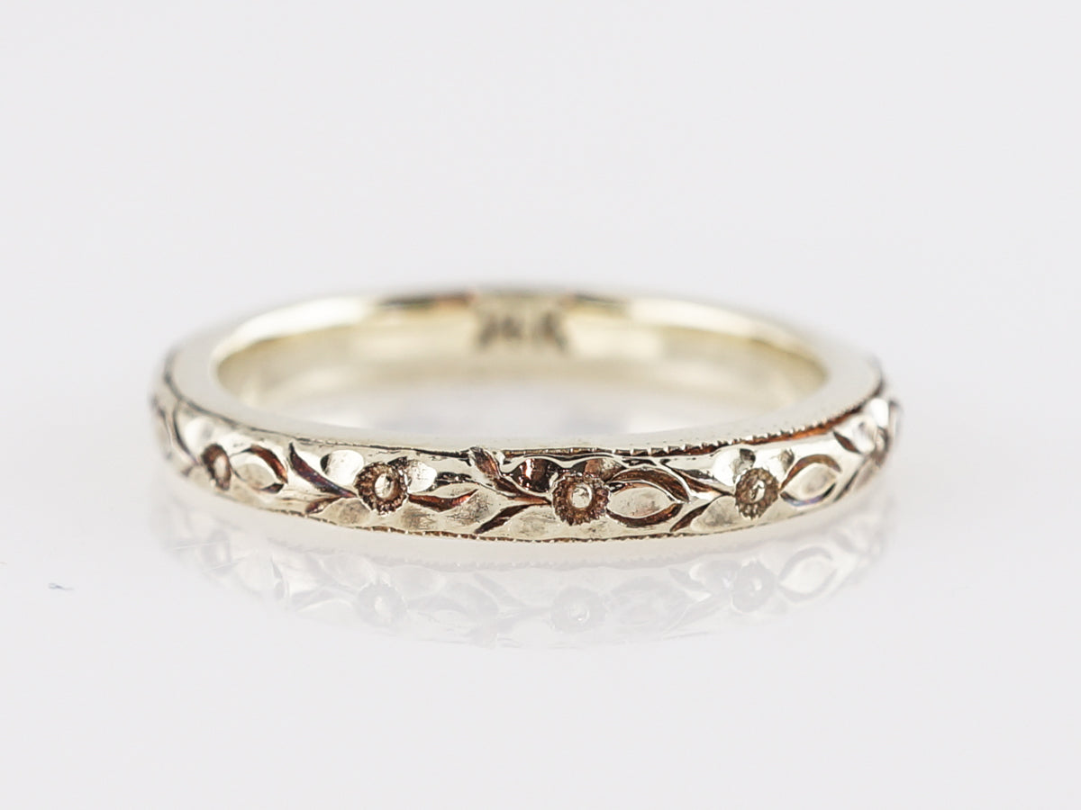 Yellow Gold Orange Blossom Wedding Band in 14k Yellow Gold. This original vintage Art Deco wedding band features a deep orange blossom engraving around the entirety of the band. Finished in 14k yellow gold with time worn milgrain borders, this band will pair nicely with a vintage engagement ring.
