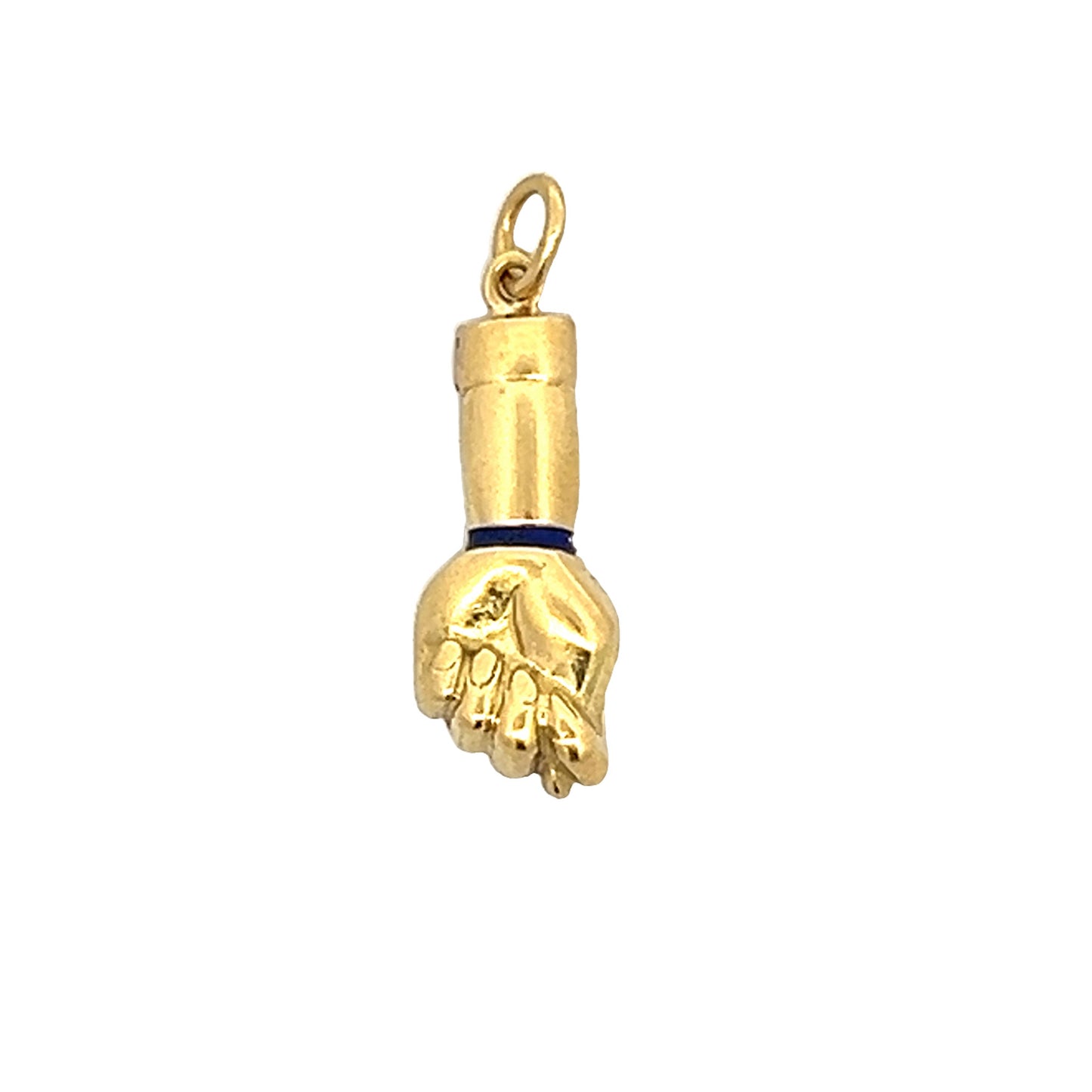 Crafted from 18 karat yellow gold, this pendant charm brings a pop of color with its blue enamel cuff on the wrist. The figa charm design has a unique meaning representing good luck and protection and is perfect for adding to a charm bracelet or wearing on its own as a necklace.