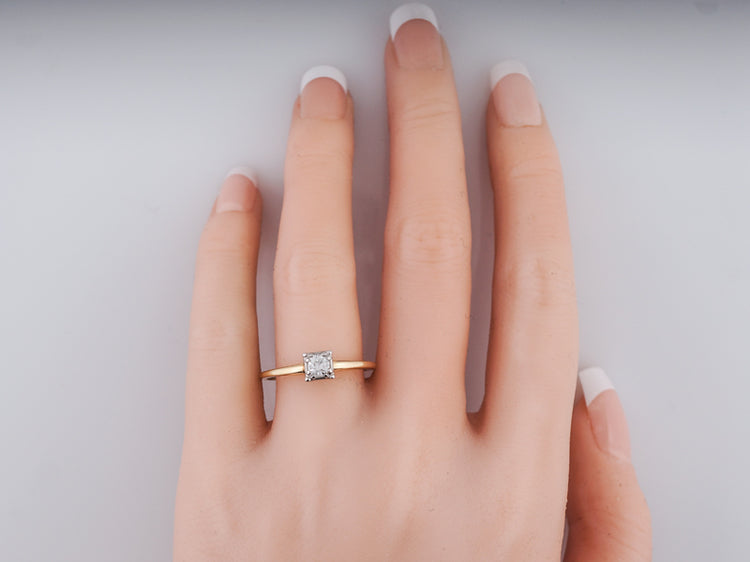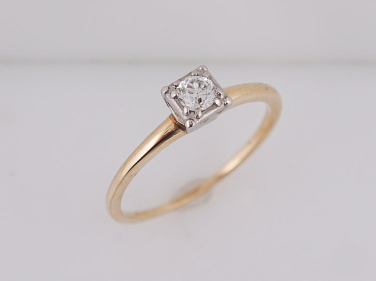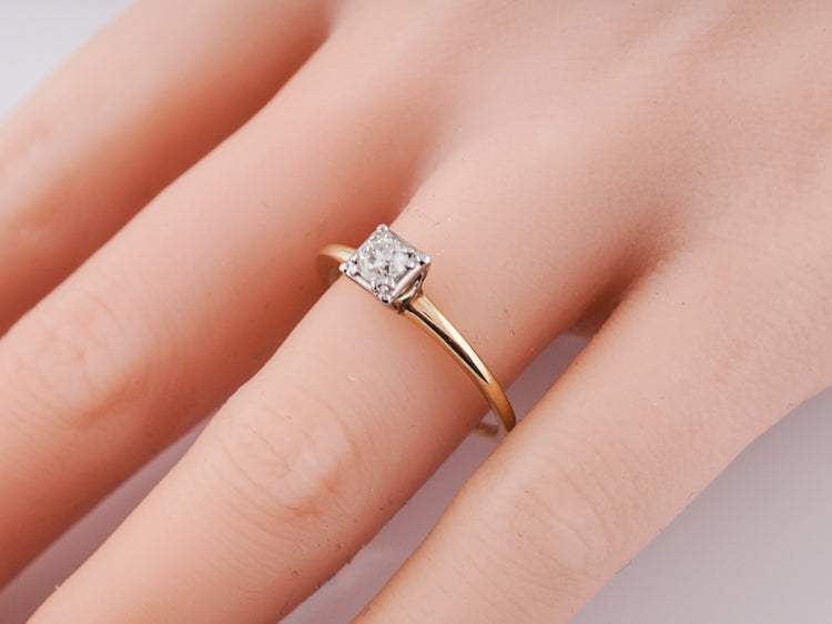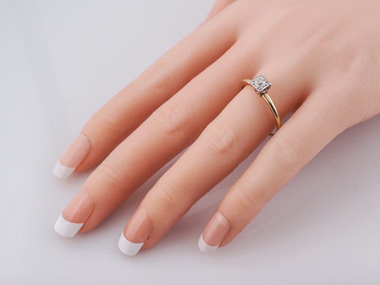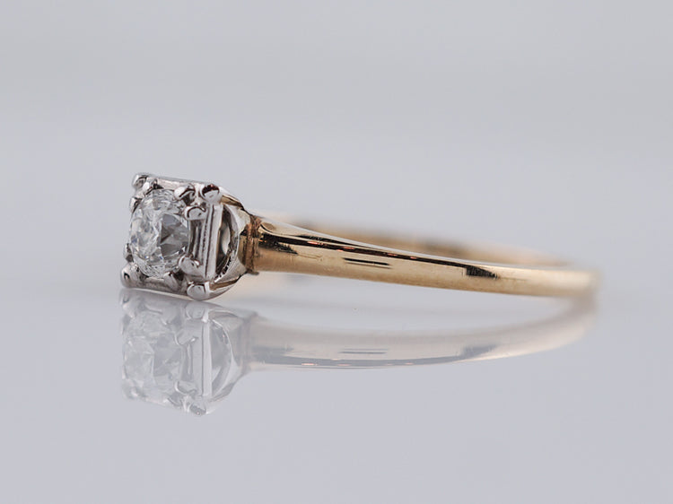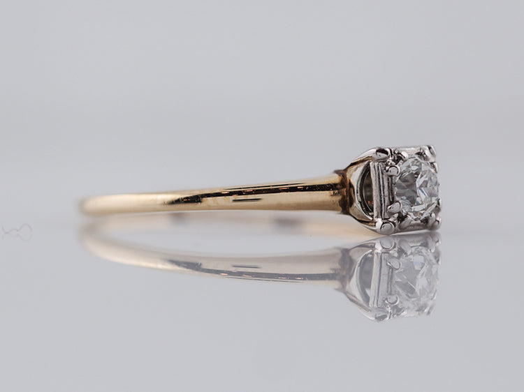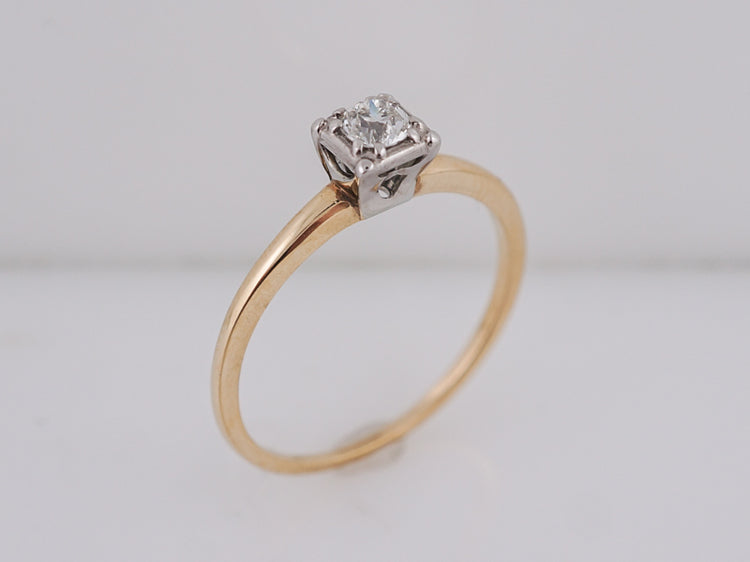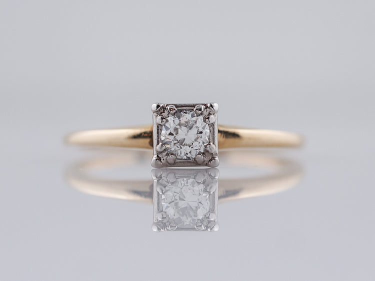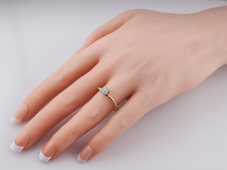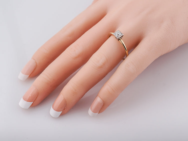Yellow gold solitaire diamond engagement ring Art Deco. A classic Deco design, this .22 carat old European cut diamond is bead set into a square 14k white gold head, giving the illusion of square. The delicate shank is beautifully finished in rich 14k yellow gold and creates a perfect contrast.