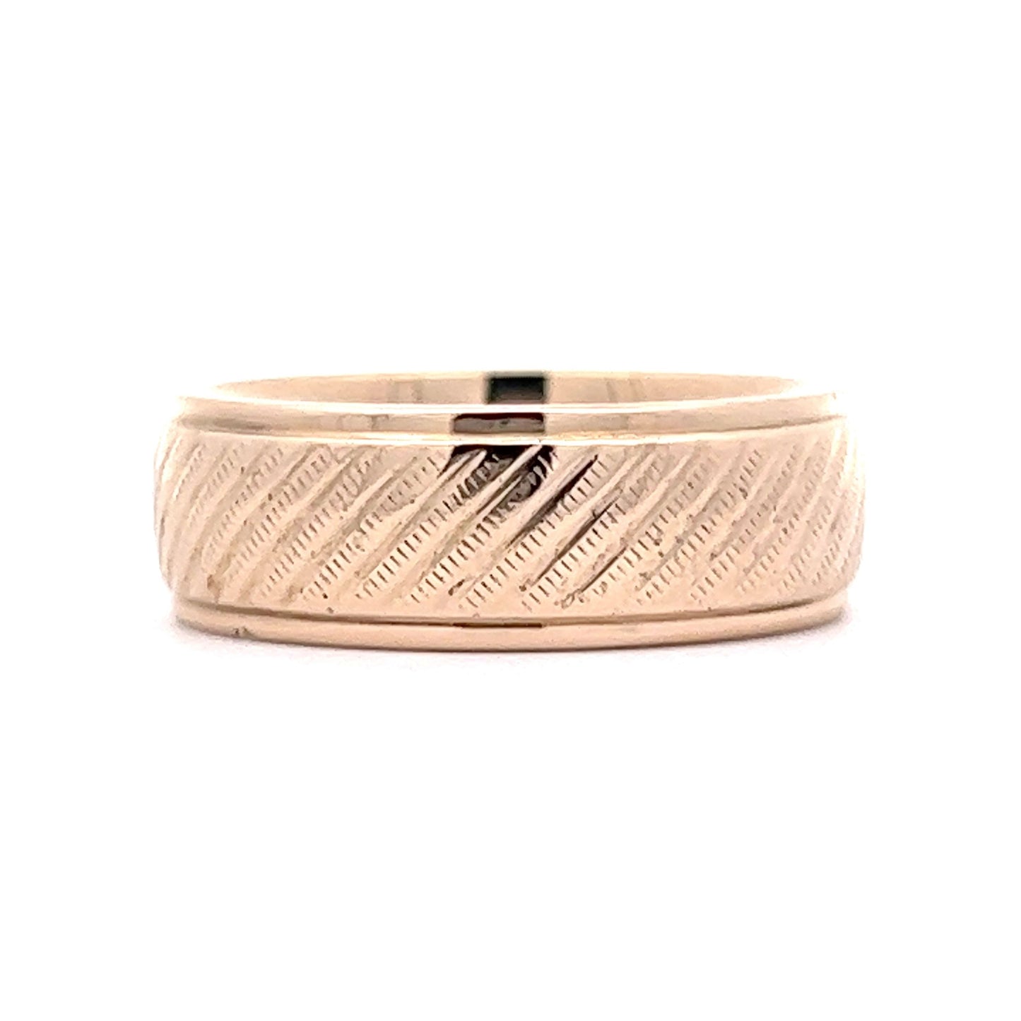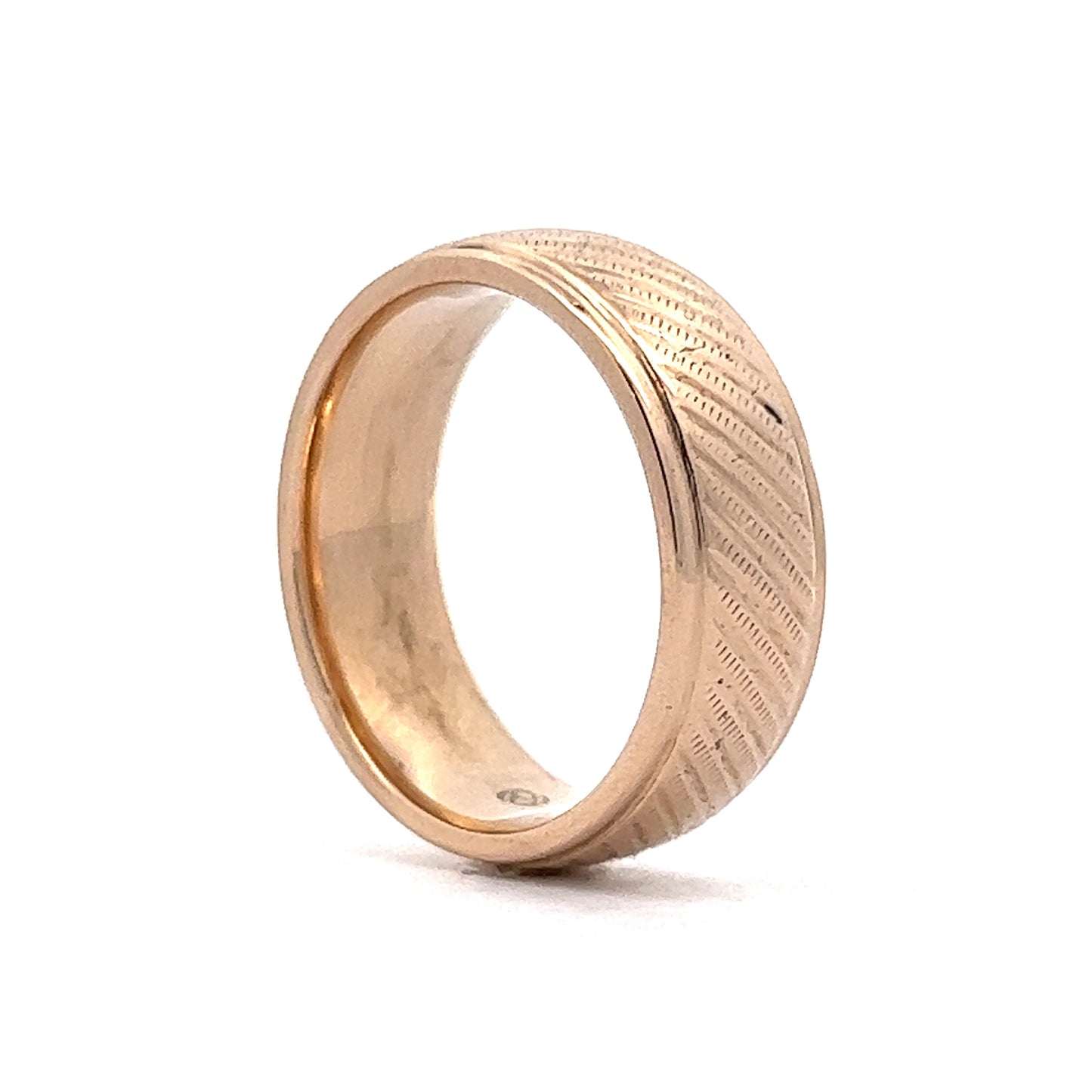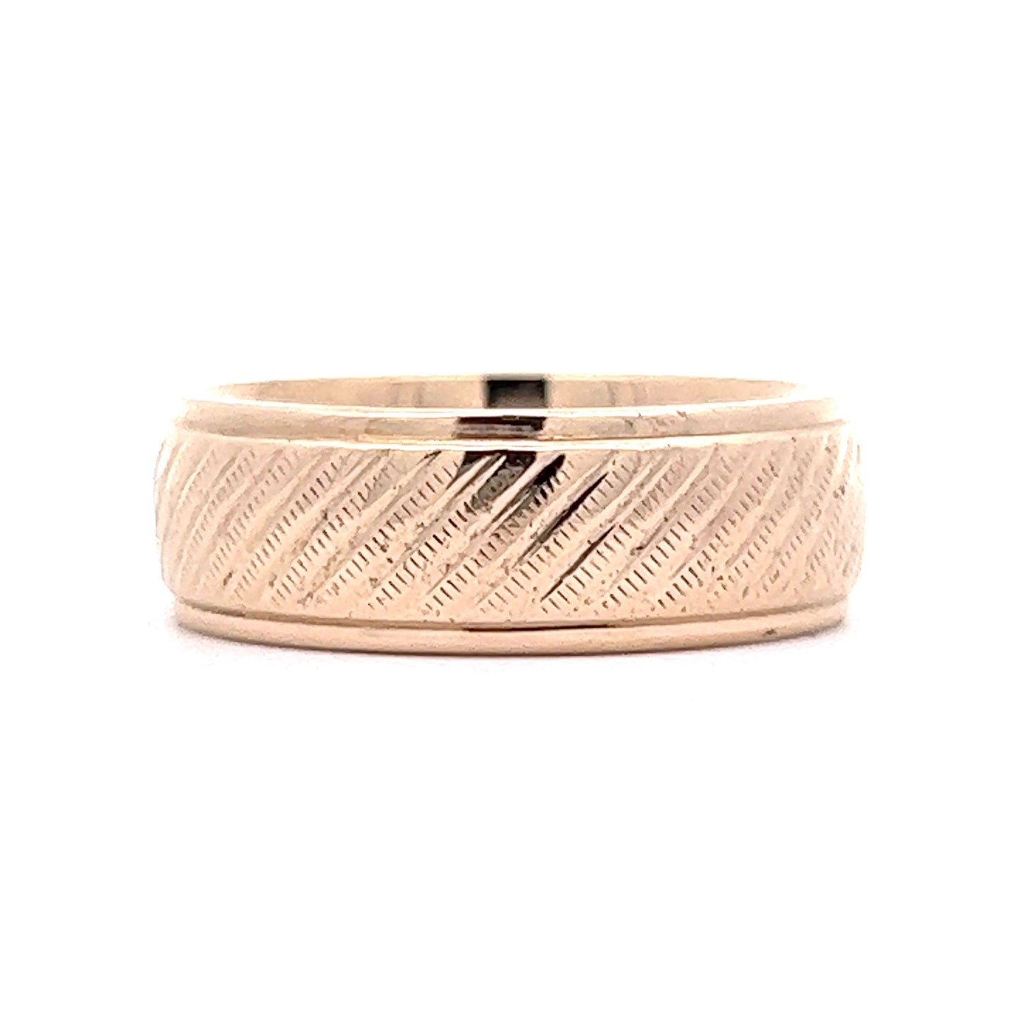 This modern and stylish men's wedding band is crafted in 14 karat yellow gold. The 8mm wide band features a textured finish, creating a unique look and feel that is the perfect balance between vintage and modern. This wedding band style is both timeless and unique.